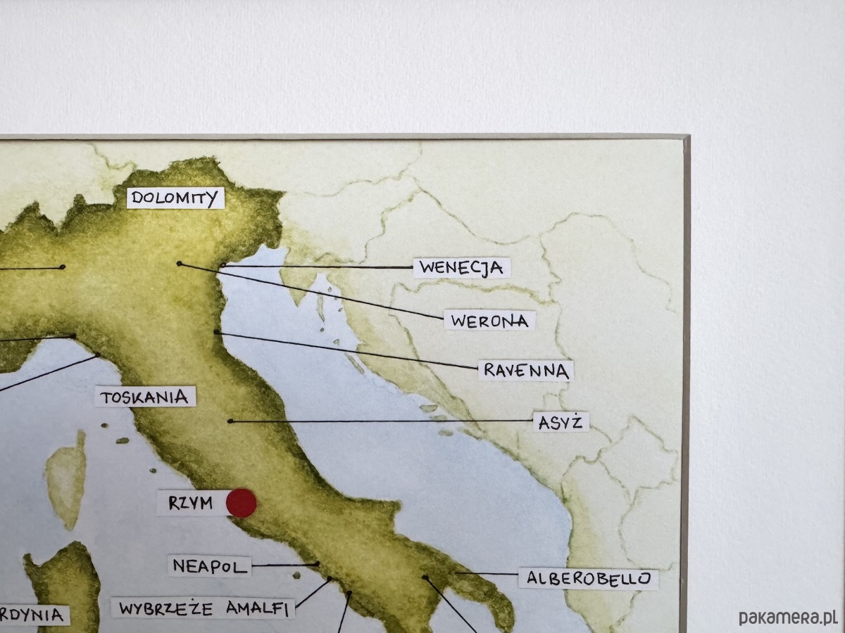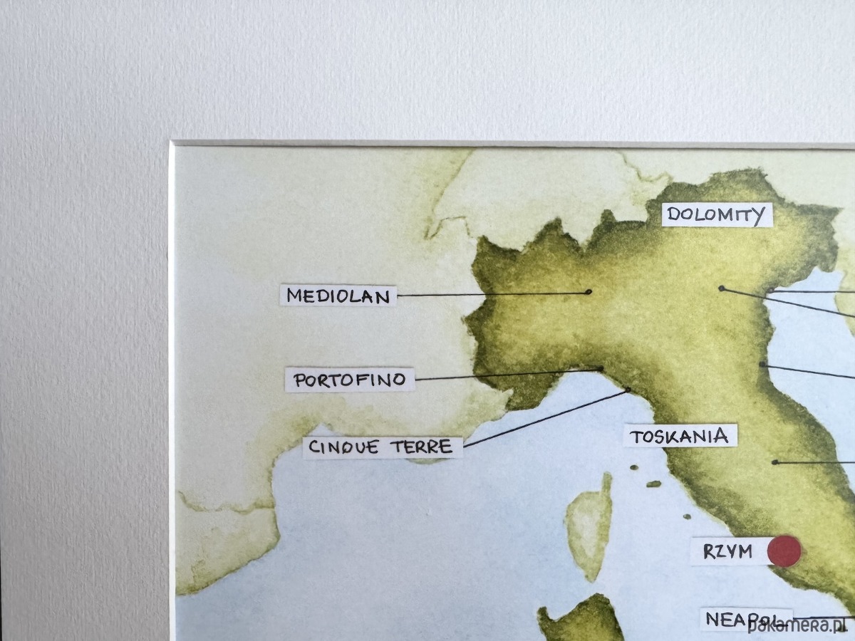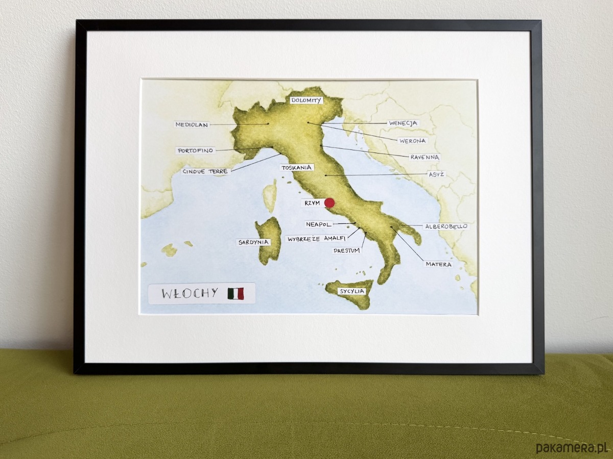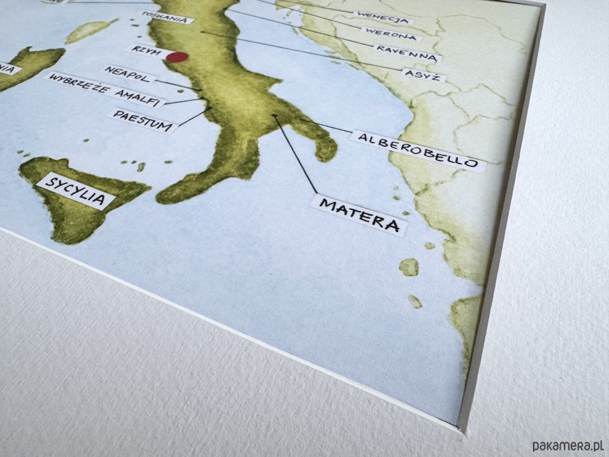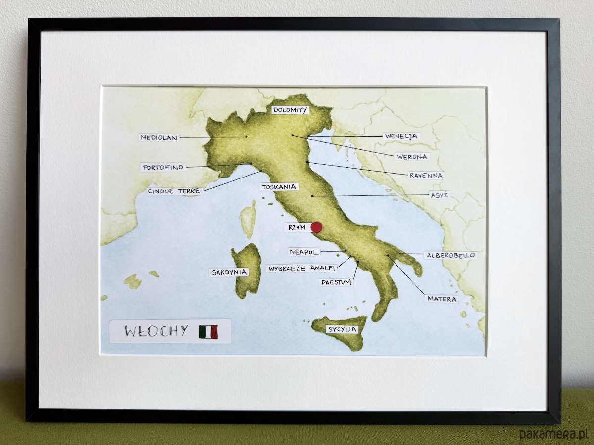 Reprodukcja ręcznie malowanej ilustracji akwarelowej przedstawiającej mapę Włoch i subiektywnie wybrane ciekawe miejsca i regiony tego kraju.
