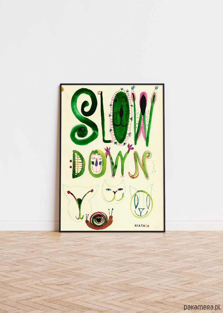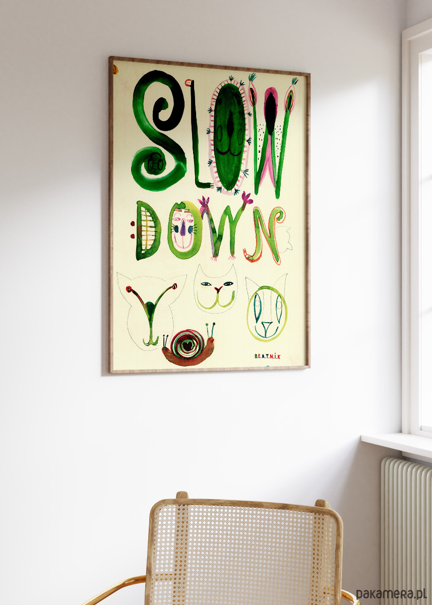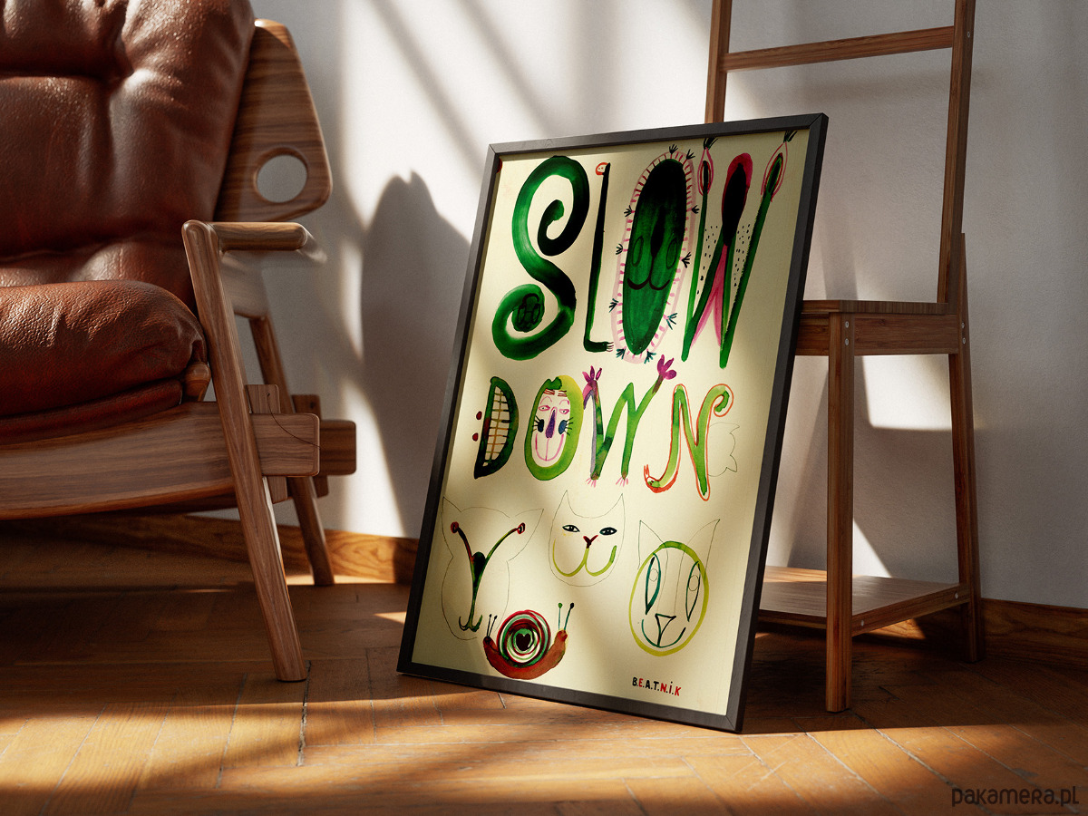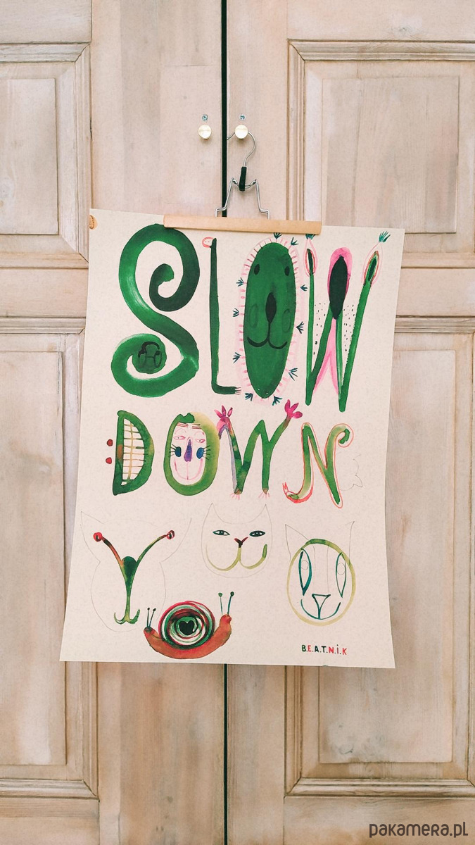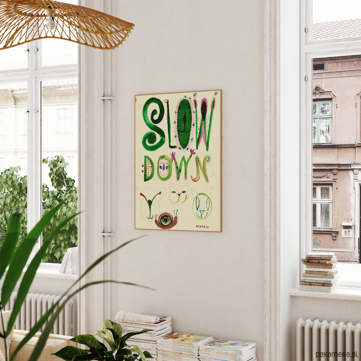 Plakat SLOW DOWN grafika ślimak BALANS PRACA ilustracja do domu