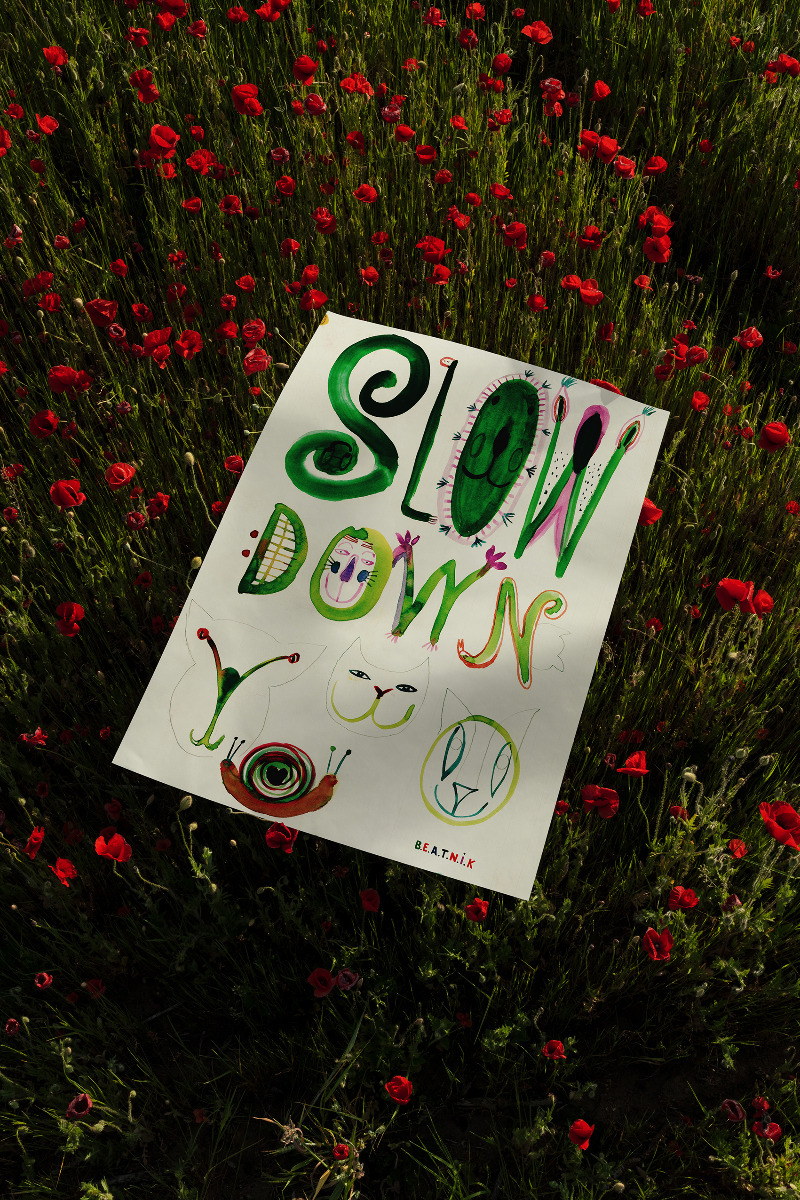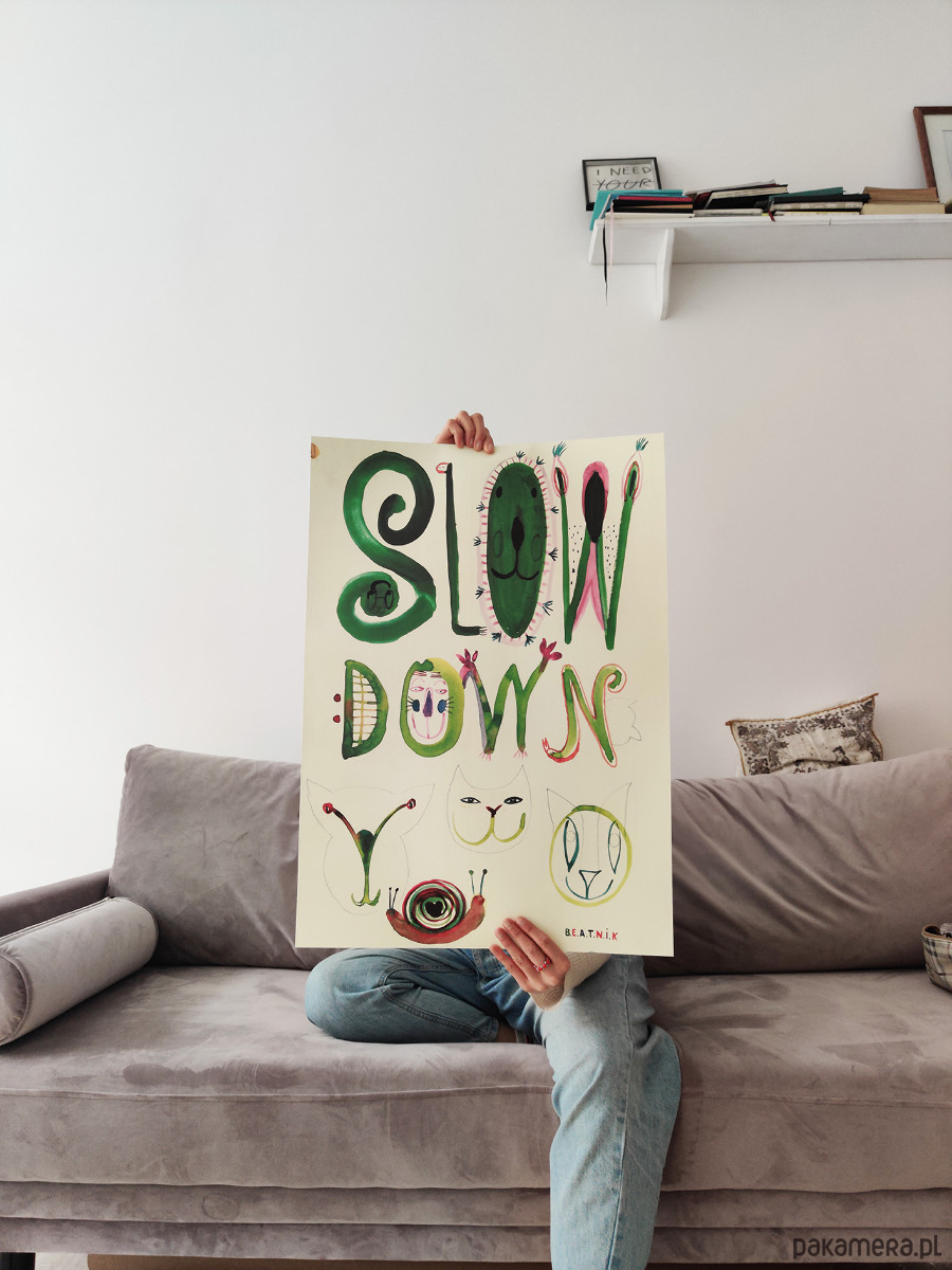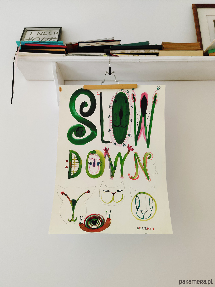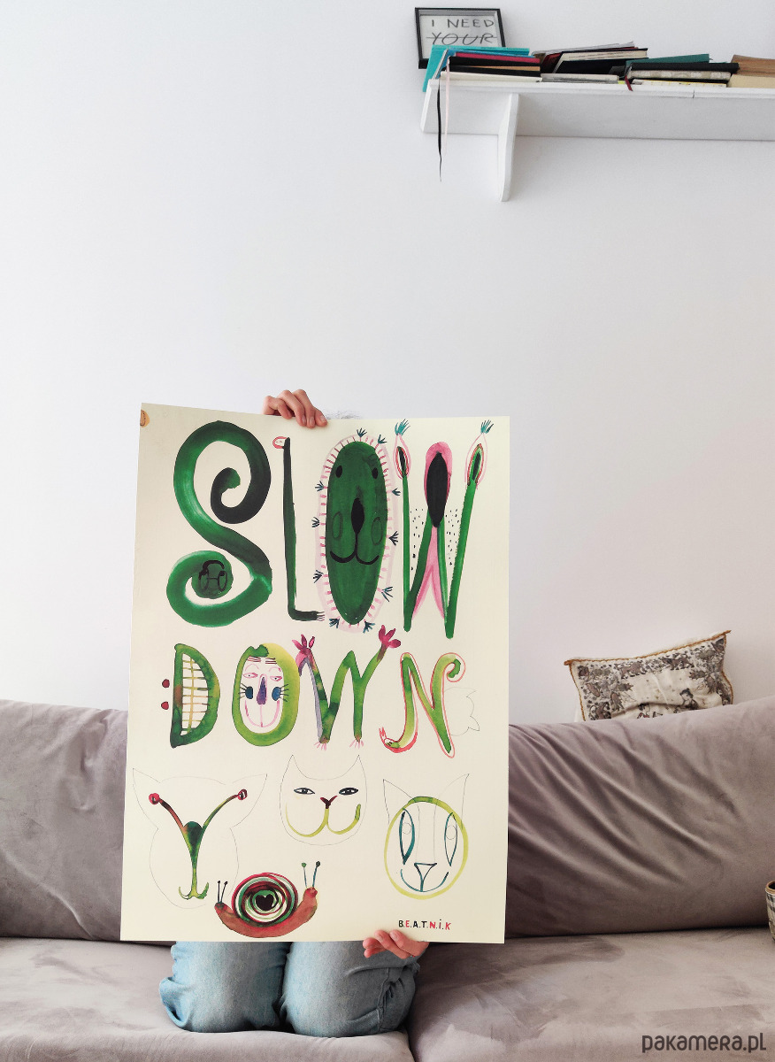 Plakat SLOW DOWN grafika ślimak BALANS PRACA ilustracja do domu