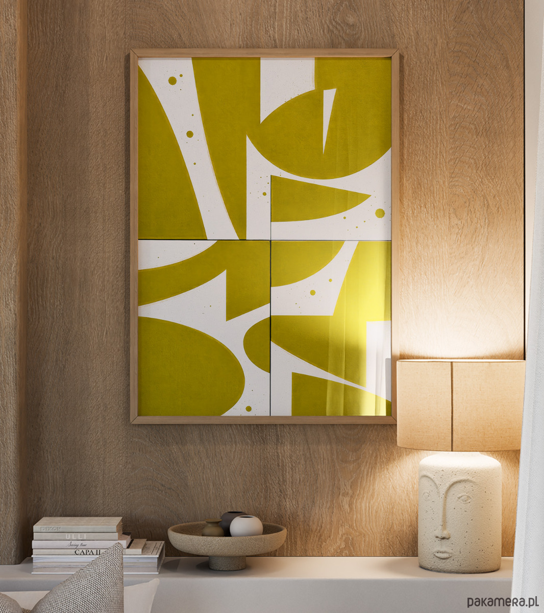 Dynamiczna energia w minimalistycznej formie. Ten plakat to intensywna kombinacja kontrastujących kształtów – od zaokrąglonych, niemal organických form, po ostre, geometryczne cięcia. Kolor topazowy, głęboki żółto-zielony, nawiązuje do natury, ale w nowoczesnym, abstrakcyjnym wydaniu. Zestawienie z białym tłem i subtelnymi plamami farby tworzy efekt przypadkowości, jakby dzieło zostało stworzone za pomocą spontanicznego pociągnięcia pędzla.