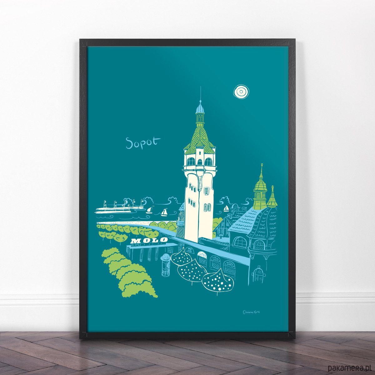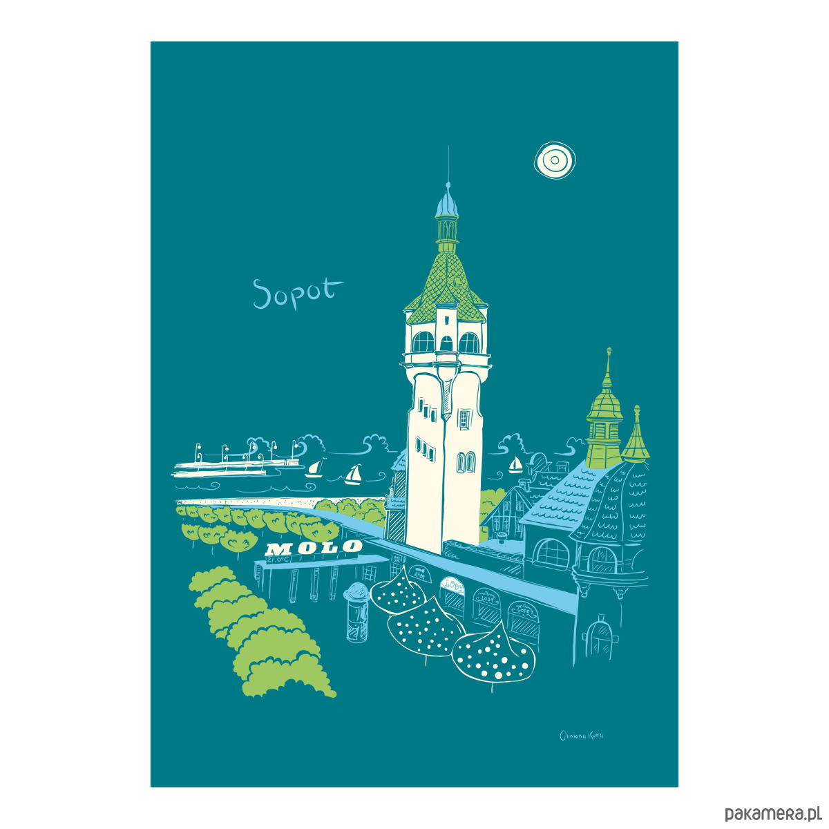 Zabytkowa latarnia morska przy wejściu na molo w Sopocie. Wieżyczki zakładu balneologicznego.