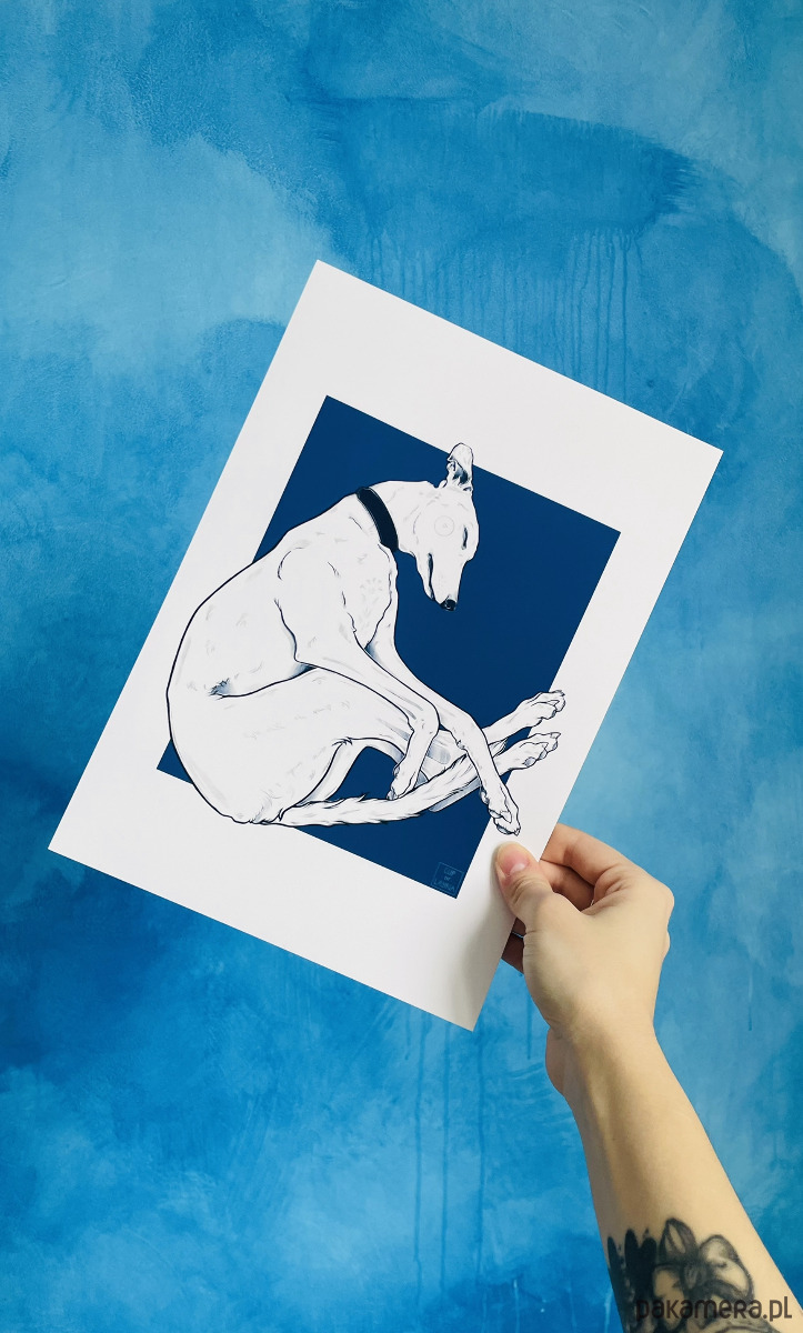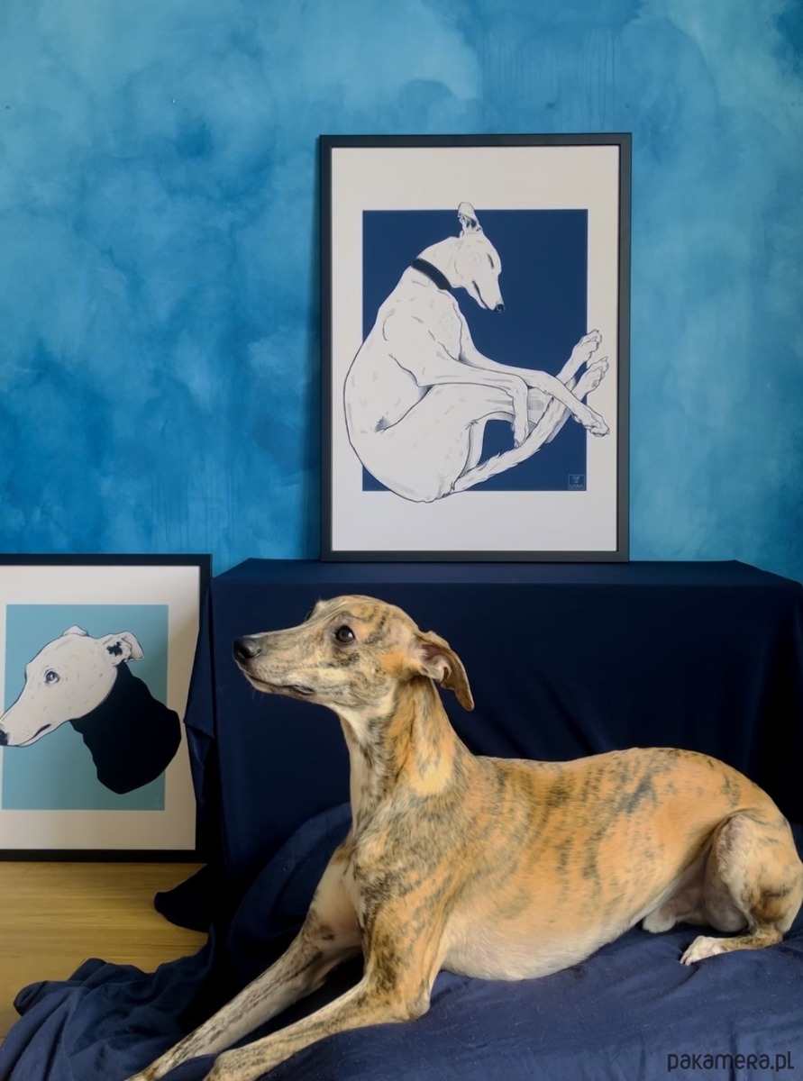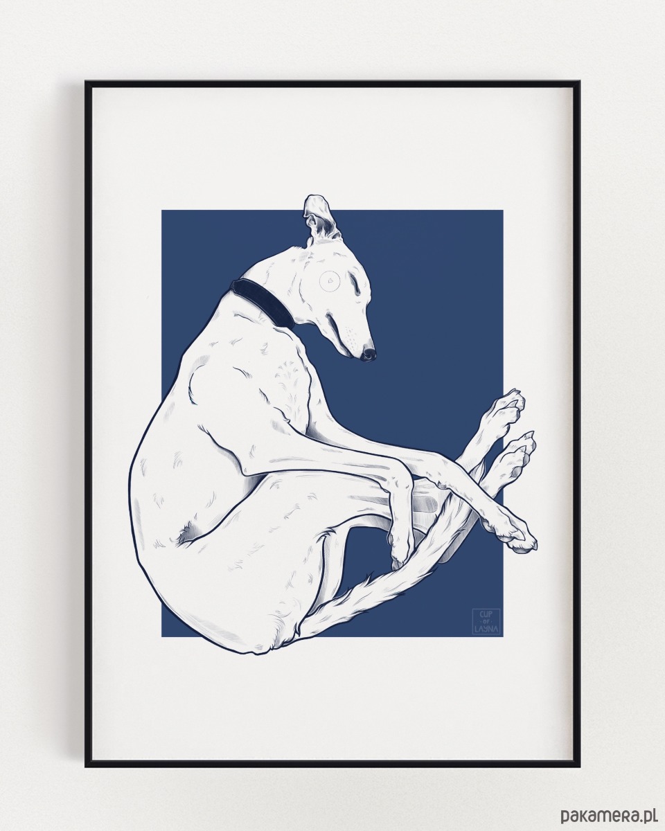 Portret śpiącego charta. To idealny plakat dla wszystkich miłośników tej rasy. Każdy chart ma w sobie coś niesamowitego i można wpatrywać się w te pieski w nieskończoność. To tacy dostojni, wyrafinowani arystokraci, a przy tym niesamowicie delikatne i przekochane mordki.