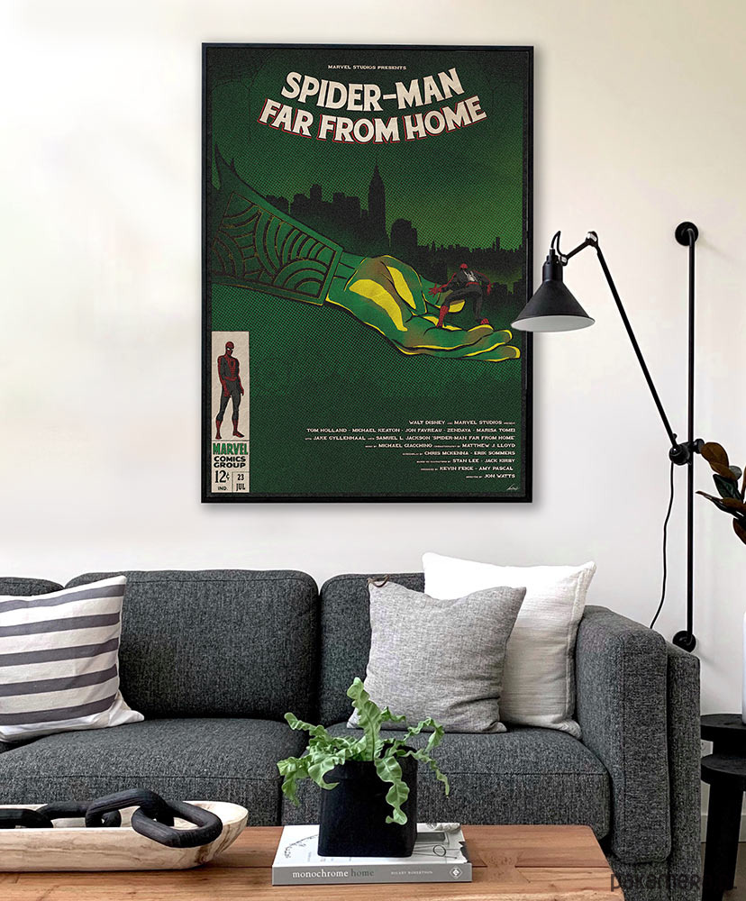 Plakat z autorską grafiką inspirowaną filmem "Spider-Man: Daleko od domu" (Spider-Man: Far from home), reż. J.Watts. Stylizowany na okładki starszych wydań komiksów ze Spider-Manem.