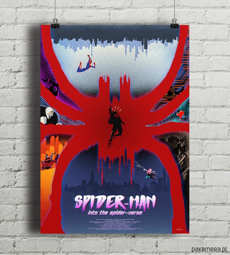 Plakat z autorską grafiką inspirowaną animowanym filmem Spider-Man: Uniwersum (Spider-Man: Into The Spider Verse), reż. B.Perschietti, P.Ramsey, R.Rothman.