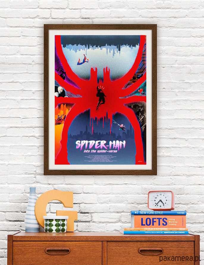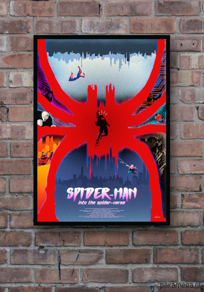 Plakat z autorską grafiką inspirowaną animowanym filmem Spider-Man: Uniwersum (Spider-Man: Into The Spider Verse), reż. B.Perschietti, P.Ramsey, R.Rothman.