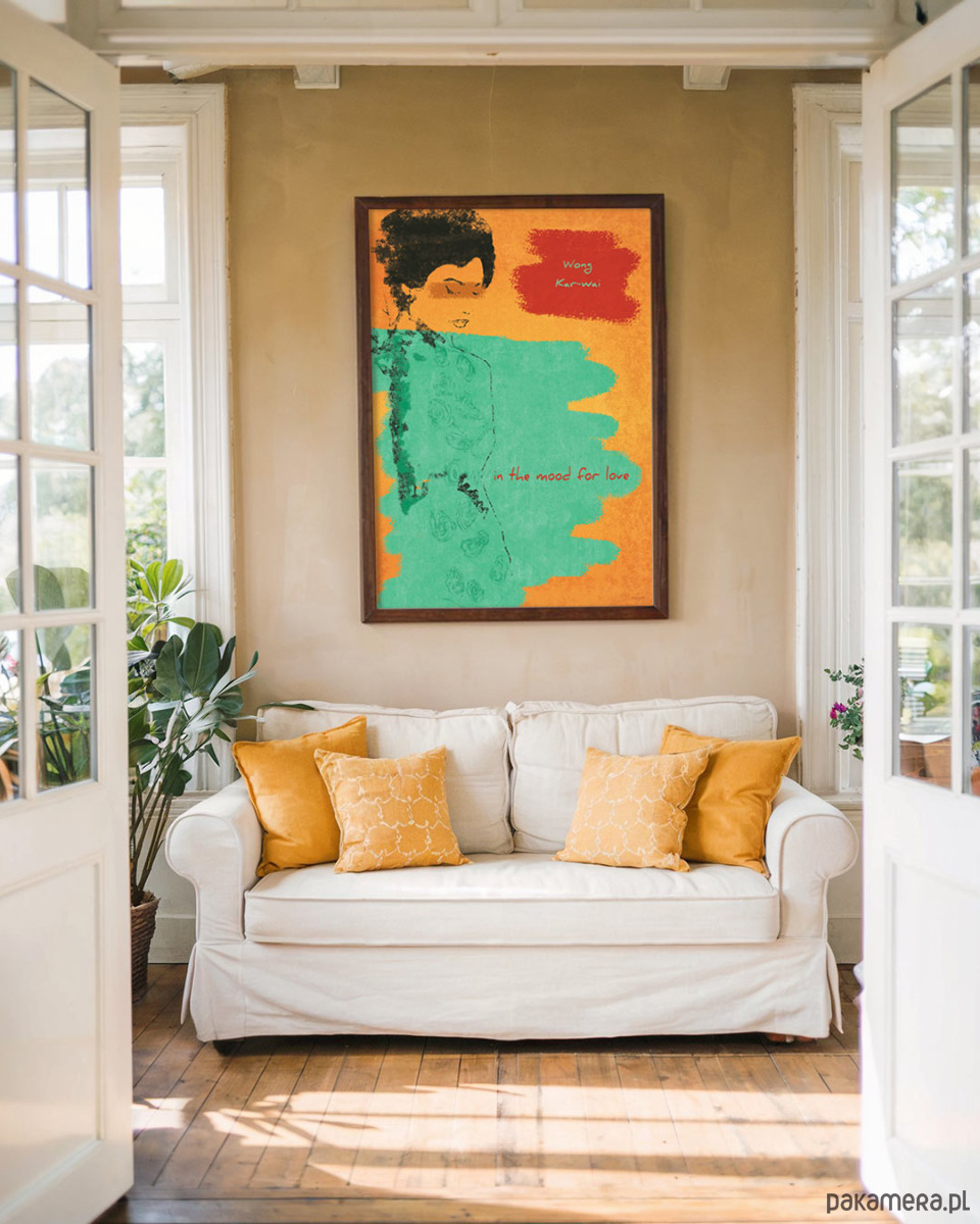 Plakat inspirowany filmem "Spragnieni miłości" ("In the Mood for Love") w reżyserii Wong Kar-Waia. To zmysłowy poemat oddający złote lata Hong Kongu przefiltrowane przez urok wspomnień. Na plakacie z abstrakcyjnie ułożonych barw wyłania się szkic głównej postaci odtwarzanej przez Maggie Cheung.