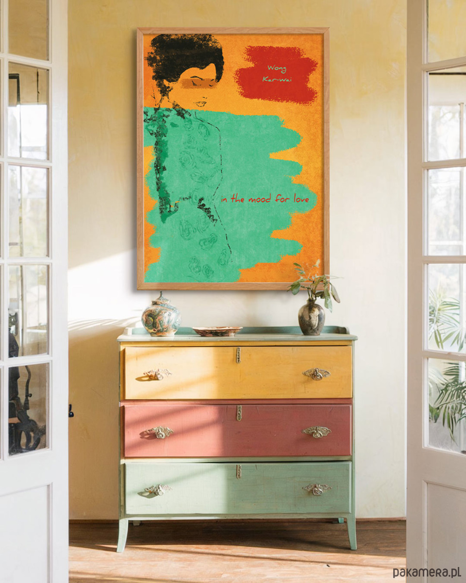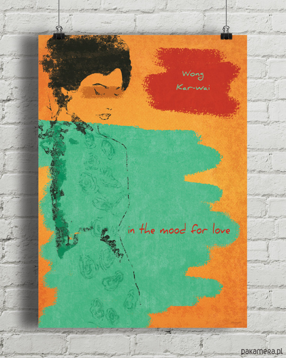 Plakat inspirowany filmem "Spragnieni miłości" ("In the Mood for Love") w reżyserii Wong Kar-Waia. To zmysłowy poemat oddający złote lata Hong Kongu przefiltrowane przez urok wspomnień. Na plakacie z abstrakcyjnie ułożonych barw wyłania się szkic głównej postaci odtwarzanej przez Maggie Cheung.