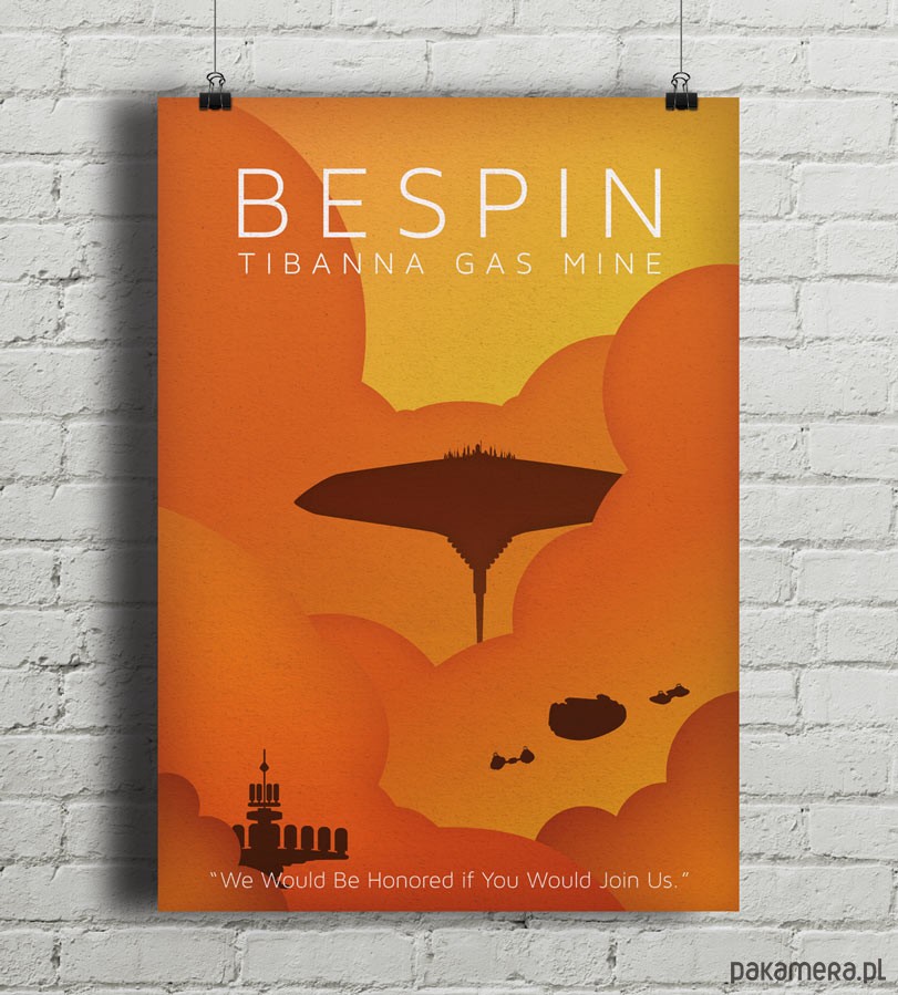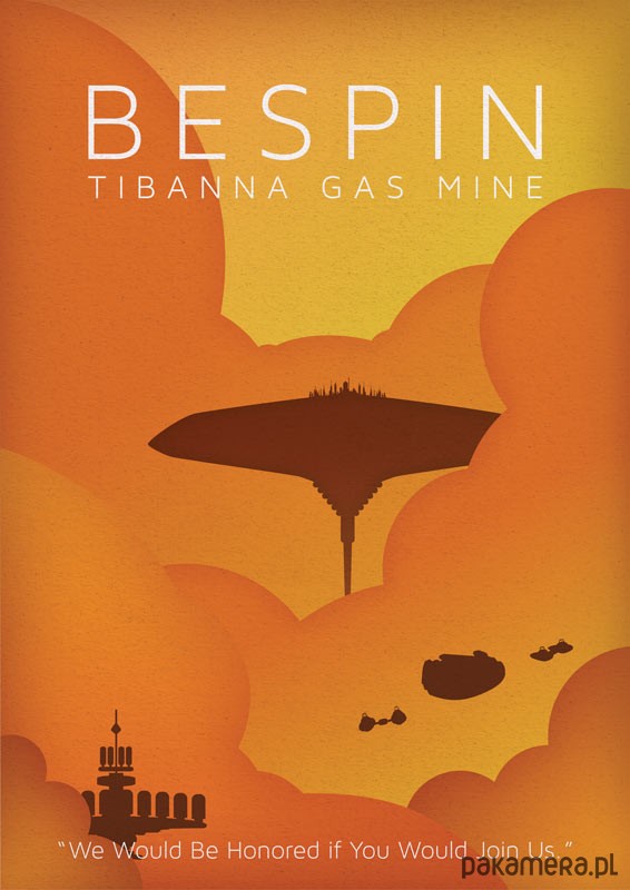Plakat z autorską grafiką inspirowany filmem Gwiezdne Wojny: Imperium Kontratakuje (Star Wars: Empire Strikes Back), reż. Irvin Kershner. Stylizowany na retro plakaty podróżnicze z lat 20-tych XX wieku. Pochodzi z serii "Star Wars Galaxy" i przedstawia Miasto w Chmurach na planecie Bespin. Na dole znajduje się cytat z wypowiedzi Dartha Vadera "We would be honored if you would join us."