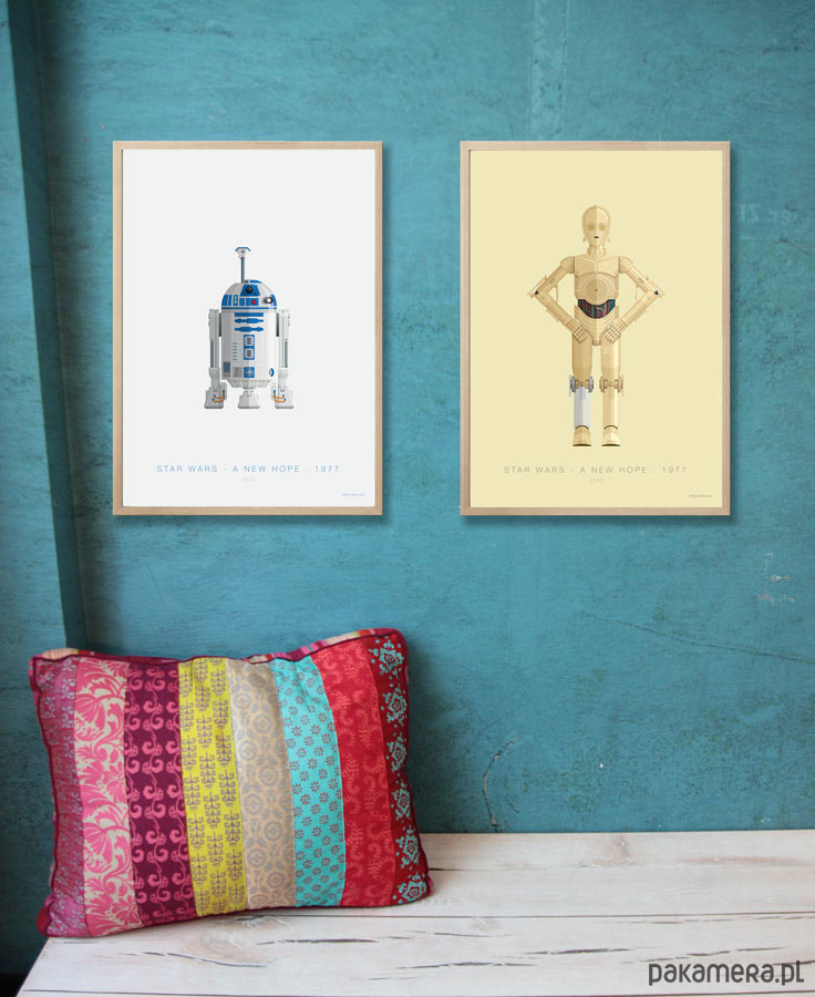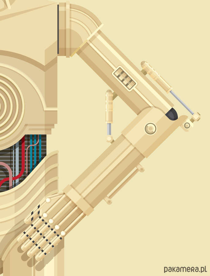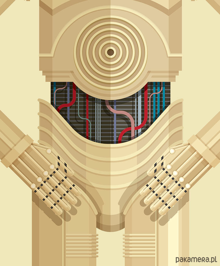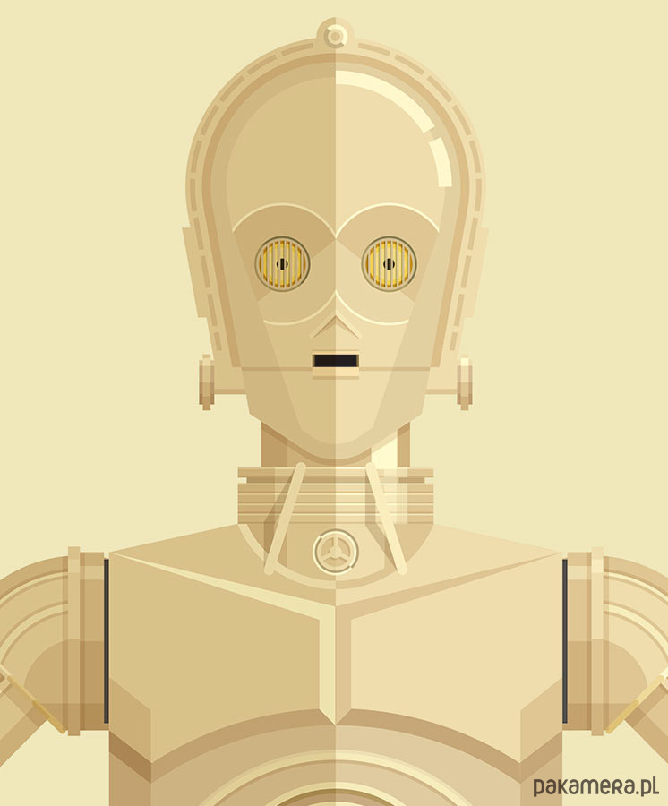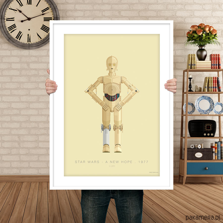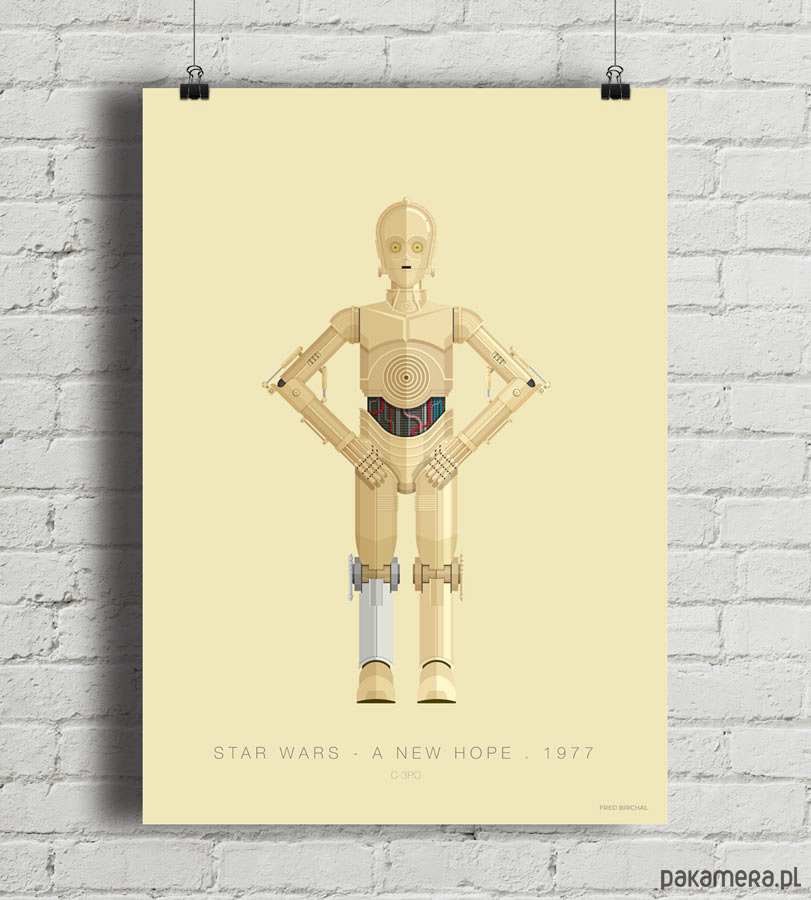 Plakat z autorską grafiką inspirowaną filmem "Gwiezdne Wojny" (Star Wars). Pochodzi z serii "Famous Robots" i przedstawia C3PO.