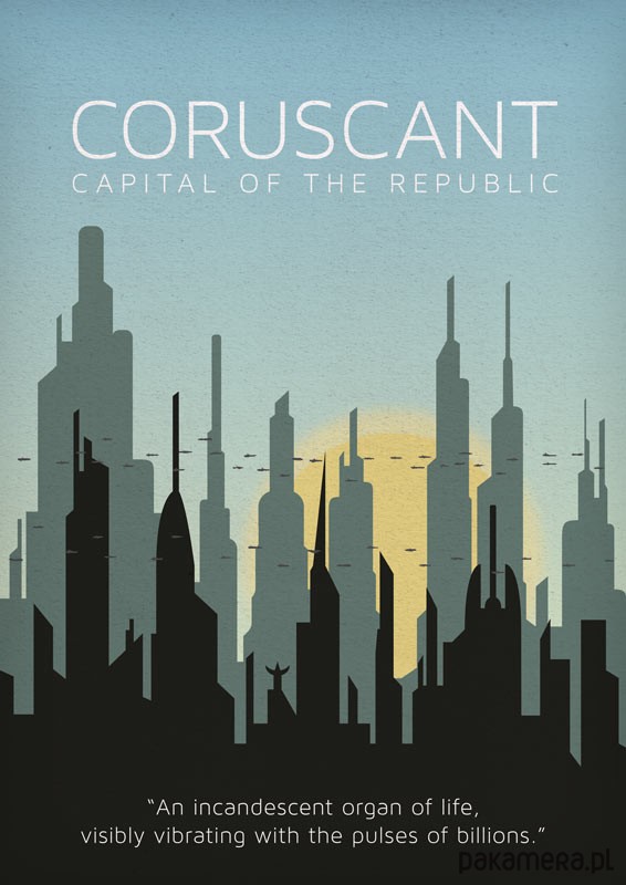 Plakat z autorską grafiką inspirowany filmem Gwiezdne Wojny: Mroczne Widmo (Star Wars: The Phantom Menace), reż. George Lucas. Stylizowany na retro plakaty podróżnicze z lat 20-tych XX wieku. Pochodzi z serii "Star Wars Galaxy" i przedstawia wielkie miasto na planecie Coruscant, stolicy galaktyki oraz imperium Palpatine'a. Na dole znajduje się cytat z wypowiedzi Wielkiego Kanclerza Signet Mezzileen'a: "An incandescent organ of life, visibly vibrating with the pulses of billions."