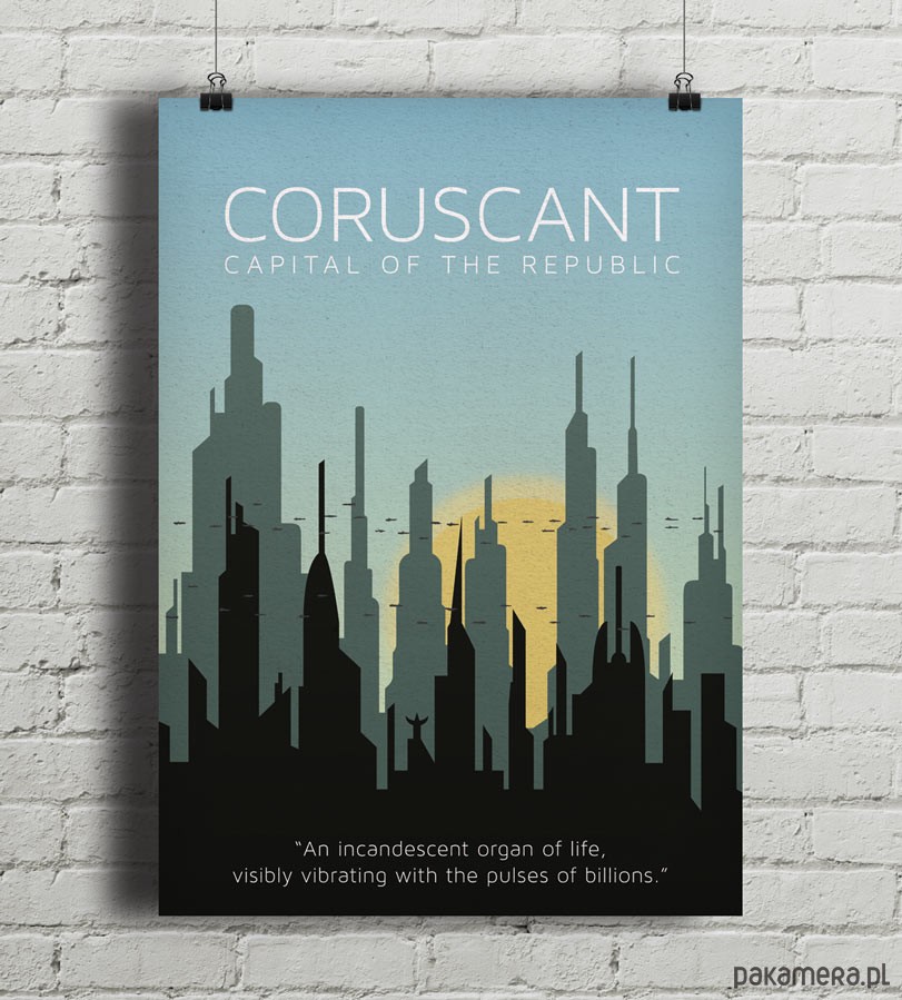 Plakat z autorską grafiką inspirowany filmem Gwiezdne Wojny: Mroczne Widmo (Star Wars: The Phantom Menace), reż. George Lucas. Stylizowany na retro plakaty podróżnicze z lat 20-tych XX wieku. Pochodzi z serii "Star Wars Galaxy" i przedstawia wielkie miasto na planecie Coruscant, stolicy galaktyki oraz imperium Palpatine'a. Na dole znajduje się cytat z wypowiedzi Wielkiego Kanclerza Signet Mezzileen'a: "An incandescent organ of life, visibly vibrating with the pulses of billions."