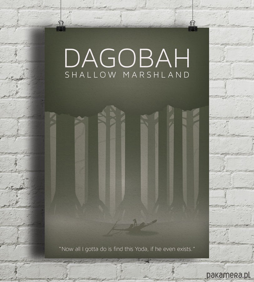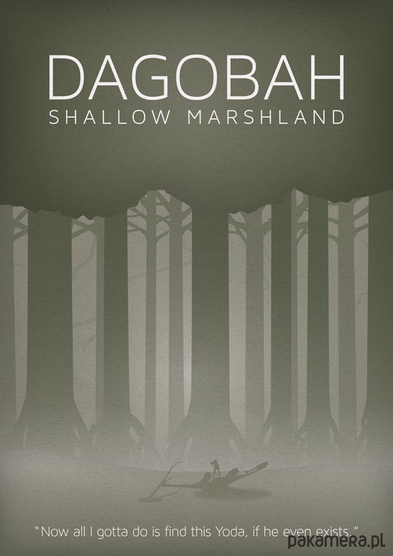 Plakat z autorską grafiką inspirowany filmem Gwiezdne Wojny: Imperium Kontratakuje (Star Wars: Empire Strikes Back), reż. Irvin Kershner. Stylizowany na retro plakaty podróżnicze z lat 20-tych XX wieku. Pochodzi z serii "Star Wars Galaxy" i przedstawia bagnisty las na planecie Dagobah. Na dole znajduje się cytat z wypowiedzi Luke Skywalkera "Now all I gotta do is find this Yoda, if he even exists."