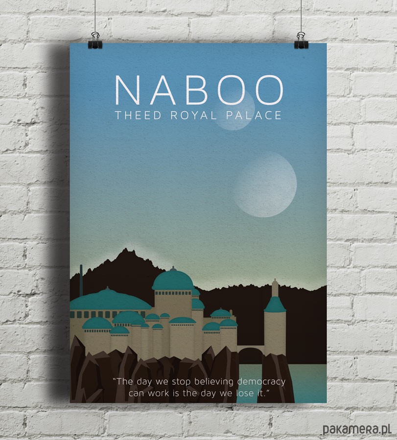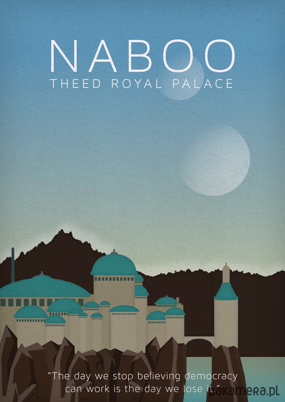 Plakat z autorską grafiką inspirowany filmem Gwiezdne Wojny: Atak Klonów (Star Wars: Attack of the Colnes), reż. George Lucas. Stylizowany na retro plakaty podróżnicze z lat 20-tych XX wieku. Pochodzi z serii "Star Wars Galaxy" i przedstawia Pałac Królewski w mieście Theed na planecie Naboo. Na dole znajduje się cytat z wypowiedzi Królowej Jamilli "The day we stop believing democracy can work is the day we lose it."