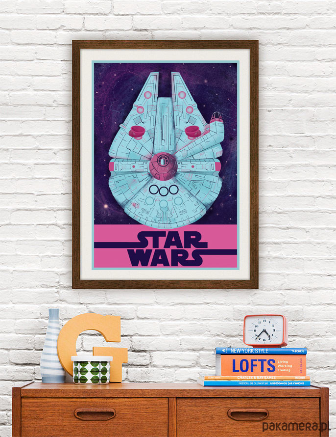 Plakat z autorską grafiką Joanny Basicz inspirowany sagą "Gwiezdne Wojny" (Star Wars), reż. G.Lucas. Przedstawia statek kosmiczny Sokół Millennium.