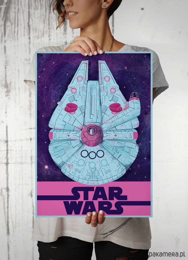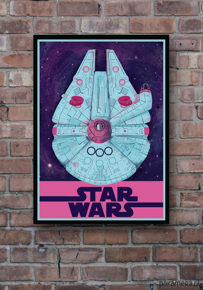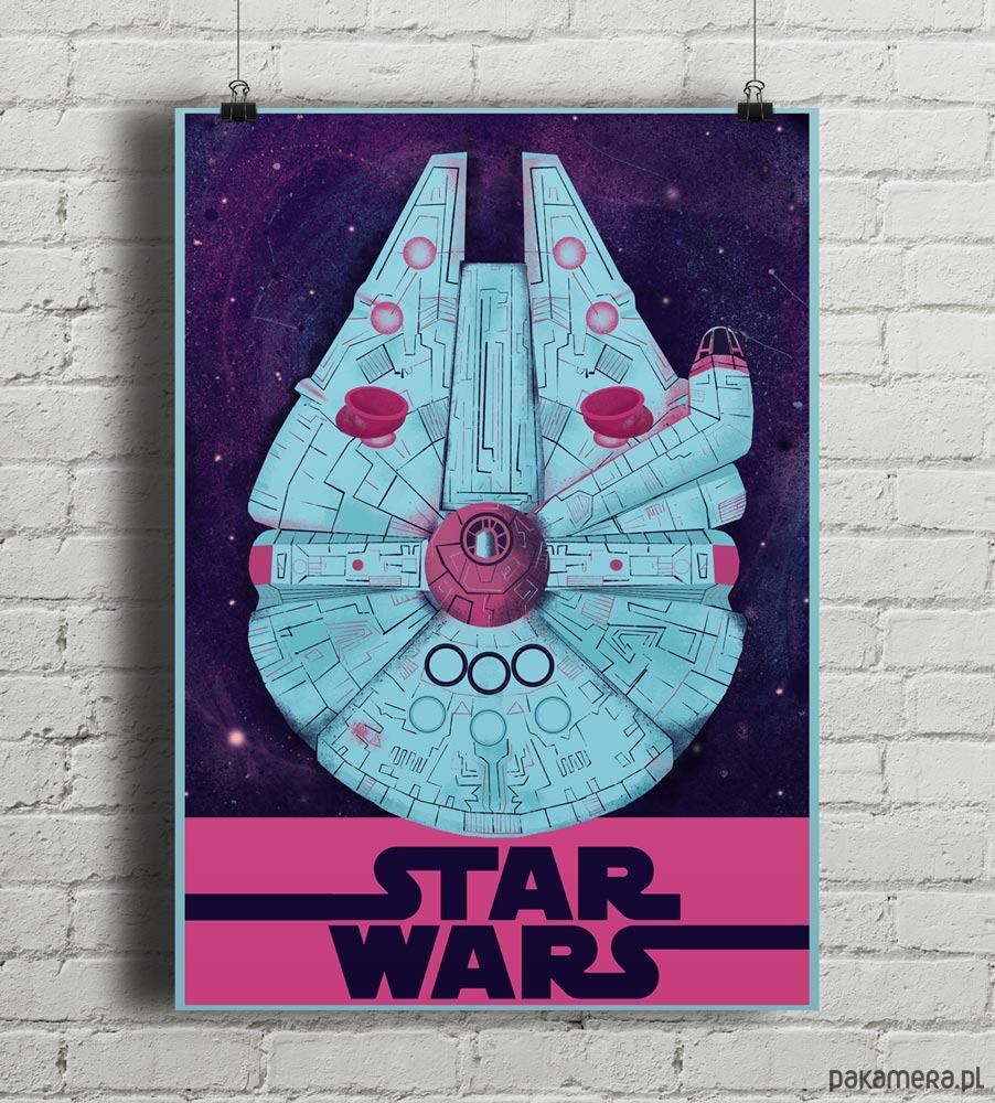 Plakat z autorską grafiką Joanny Basicz inspirowany sagą "Gwiezdne Wojny" (Star Wars), reż. G.Lucas. Przedstawia statek kosmiczny Sokół Millennium.
