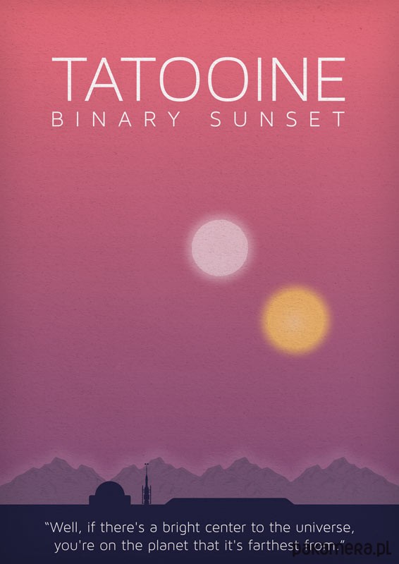 Plakat z autorską grafiką inspirowany filmem Gwiezdne Wojny (Star Wars), reż. George Lucas. Stylizowany na retro plakaty podróżnicze z lat 20-tych XX wieku. Pochodzi z serii "Star Wars Galaxy" i przedstawia pustynny krajobraz planety Tatooine, z zachodzącymi nad nią dwoma słońcami. Na pierwszym planie widoczny jest dom Owena i Beru Larsów (wujostwa Luke Skywalkera). Na dole znajduje się cytat z wypowiedzi Skywalkera: "Well, if there's a bright center to the universe, you're on the planet that it's farthest from."
