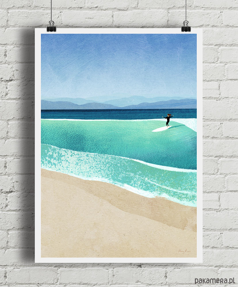 Plakat odzwierciedla w stu procentach radosną naturę surfingu. Grafika przedstawia moment, gdy dziewczyna złapała idealną falę, która nie przestaje jej unosić. Surferski plakat to świetna dekoracja z letnim klimacie.