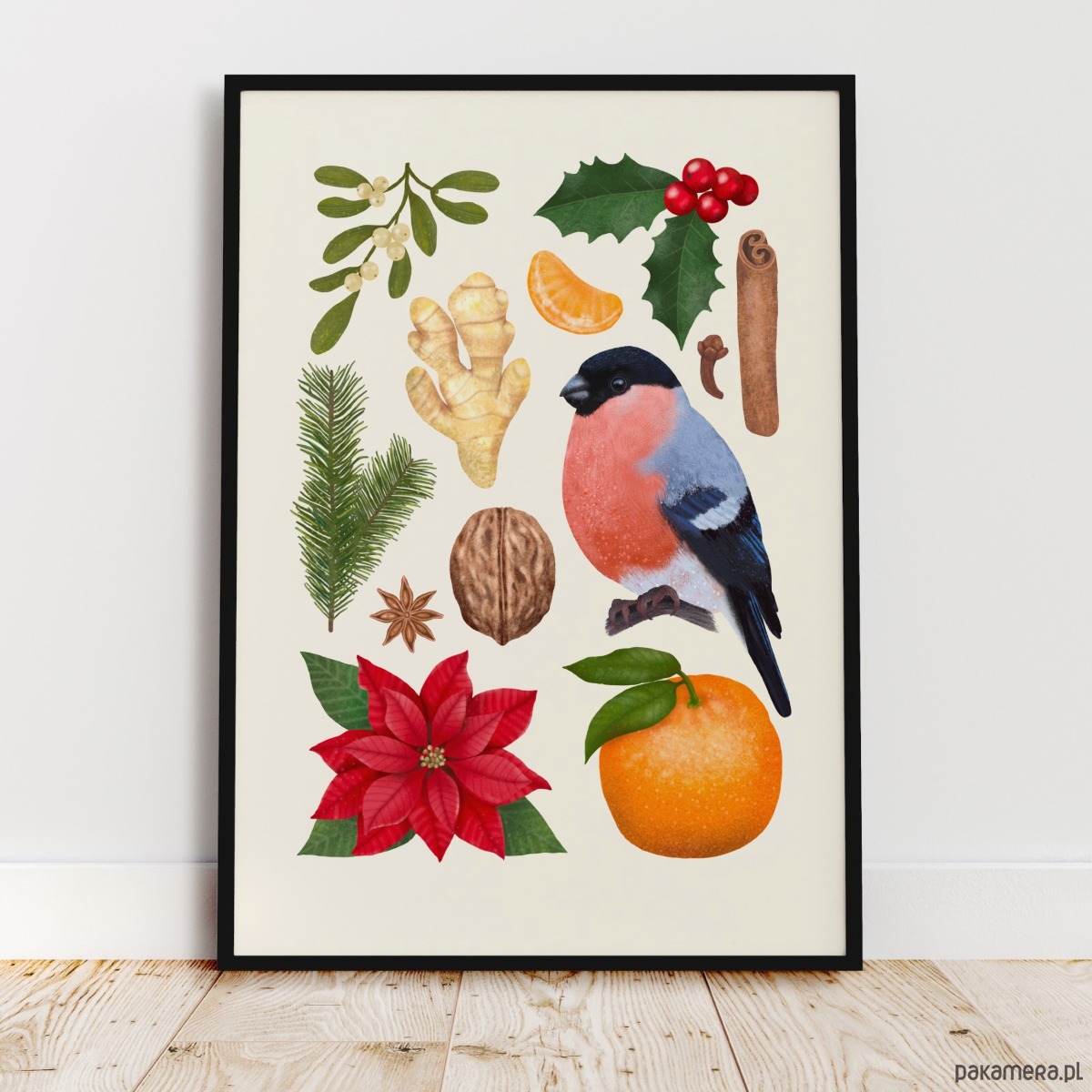 Plakat "Święta" przedstawia zbiór ilustracji takich jak: goździki, cynamon, mandarynki, jemioła i ptaszka gila, które kojarzą się z okresem okołoświątecznym. Te elementy przywołują świąteczny klimat w naturalnej odsłonie.