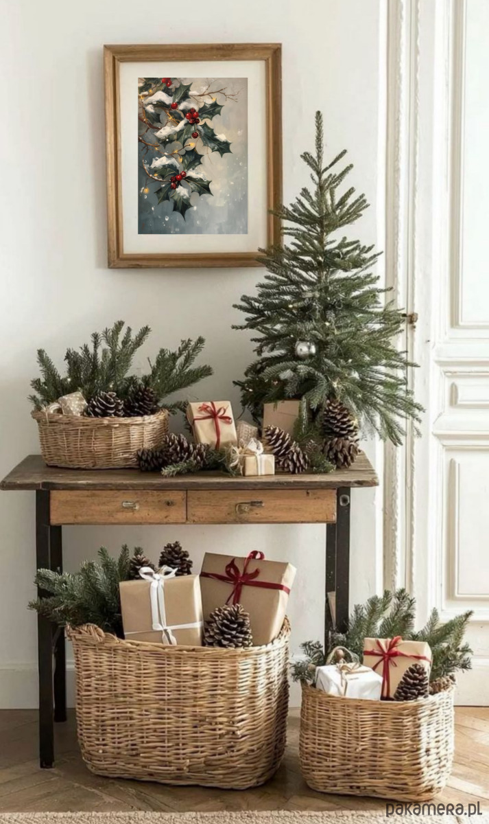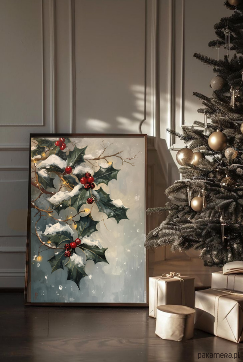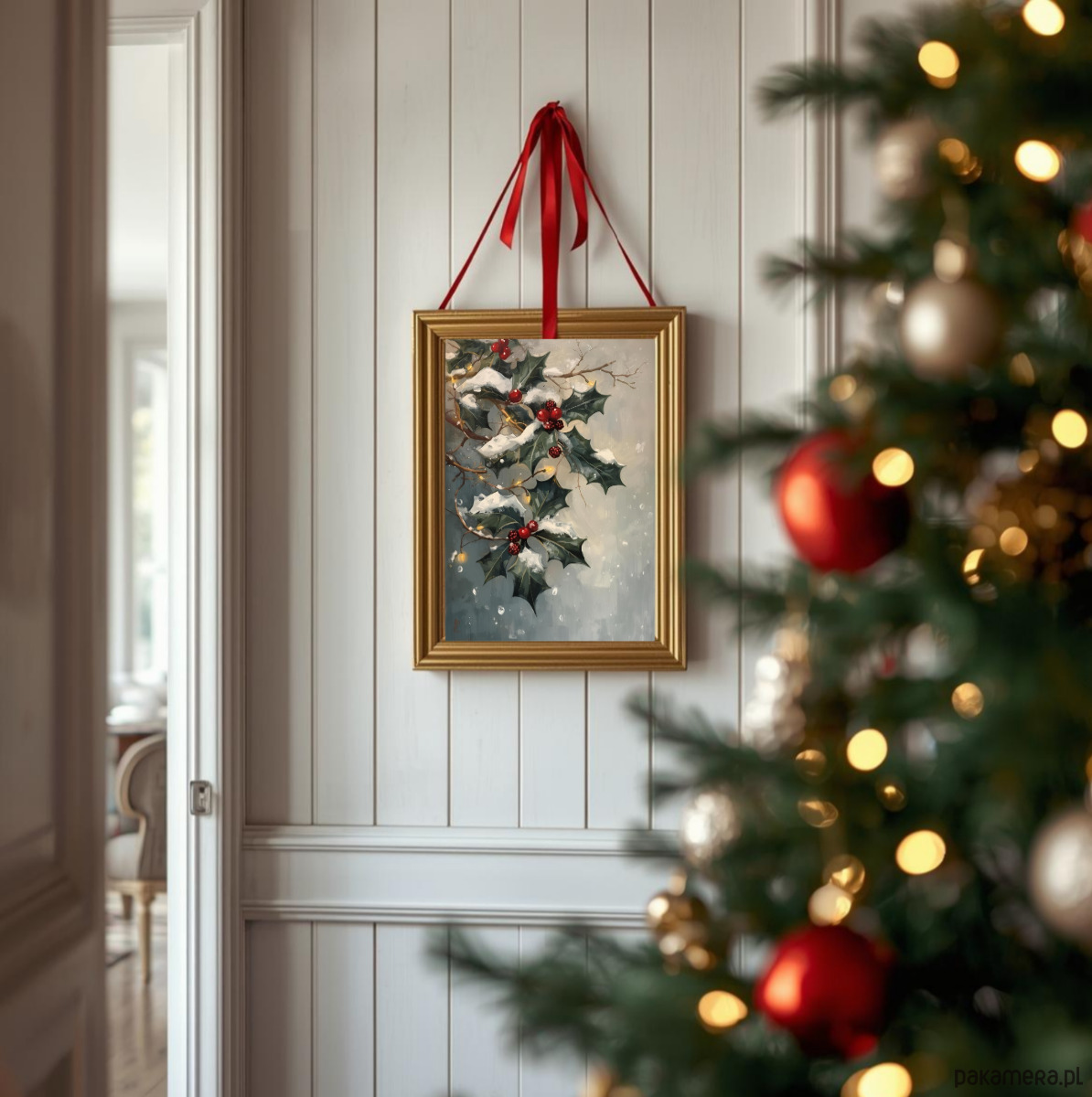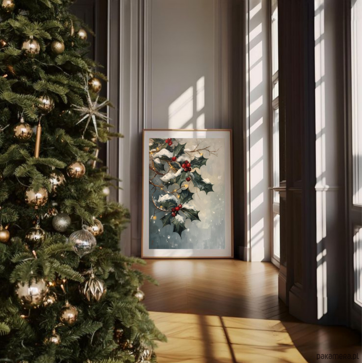 PLAKAT świąteczny ostrokrzew vintage grafika dekoracja