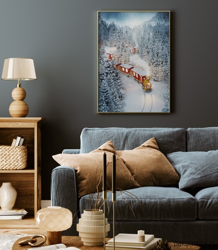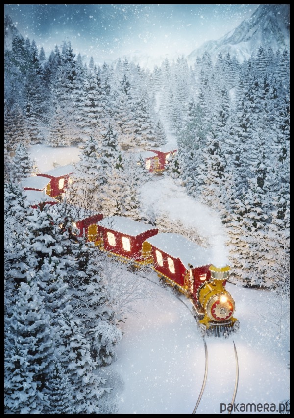 Klimatyczny plakat "Świąteczny pociąg" w scenerii zimowo-świątecznej, przywołujący na myśl popularną ciężarówkę znanej marki.