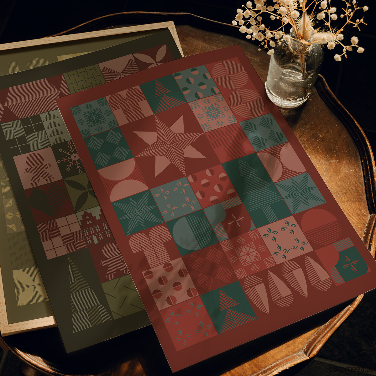 Plakat świąteczny z nutką vintage, w zgaszonych kolorach czerwieni, różu i zieleni.