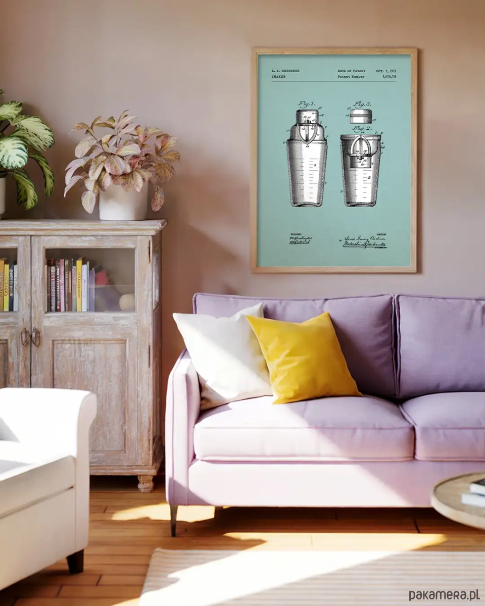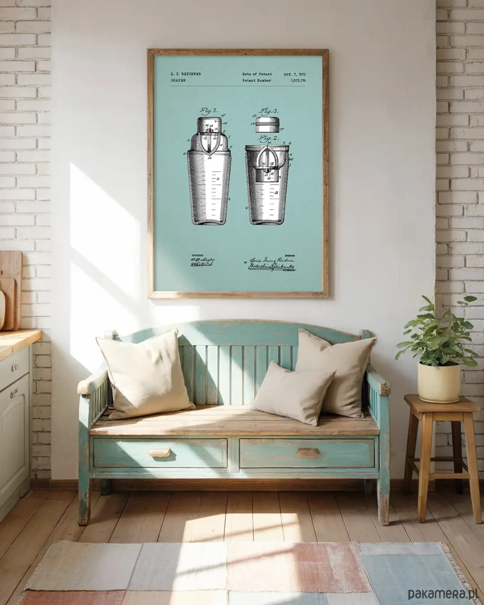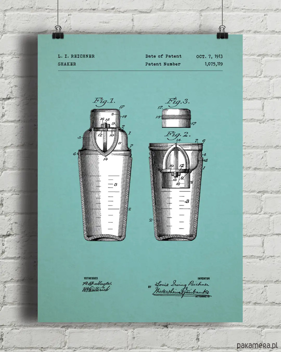 Plakat "Szejker" łączy prostotę surowego rysunku technicznego z głęboką barwą stalowo-niebieskiego tła. Idealnie nadaje się do kuchni i jadalni, ale też do salonu urządzonego w minimalistycznym stylu. Inspirowany jest reprodukcją patentu z 1913 roku. Świetnie prezentuje się solo jak i w ożywczym zestawie plakatów z naszej kuchennej serii technicznej.