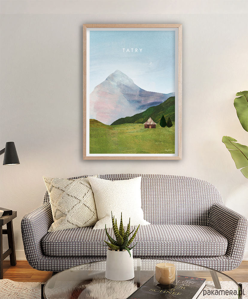 Plakat Tatry przedstawia widok na drewnianą bacówkę u podnóża majestatycznej góry. Ciepłe, stonowane kolory sprawdzą się w niemal każdym wnętrzu.