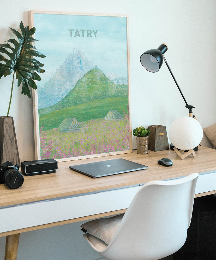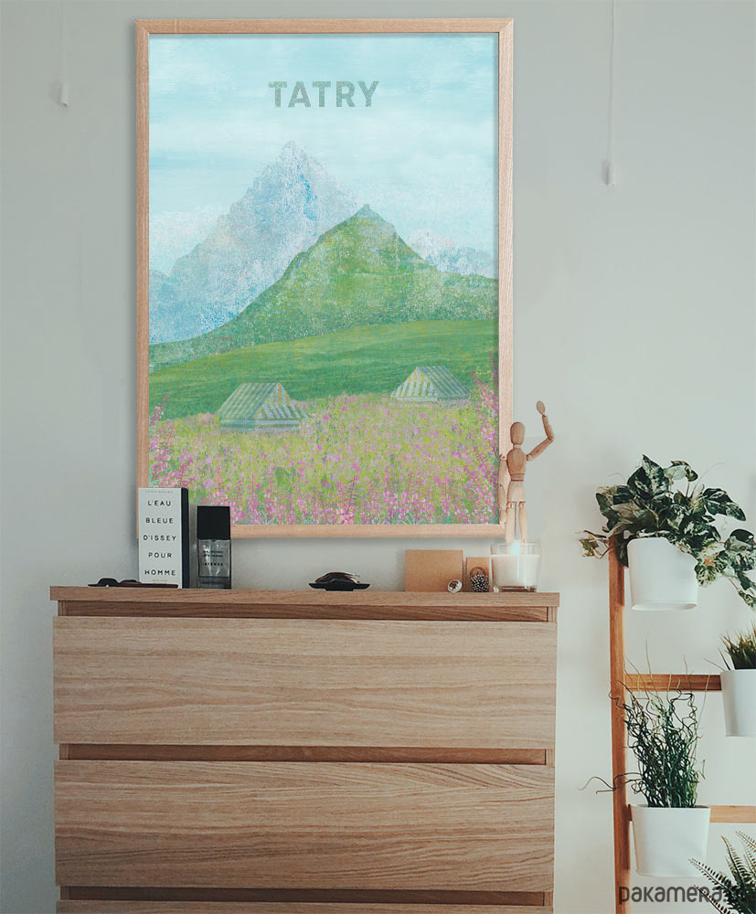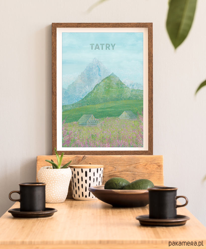Plakat inspirowany letnim widokiem Hali Gąsienicowej z kwitnącym dywanem fioletowo-różowej wierzbówki kiprzycy. w tle wznosi się zielony wznosi się Mały Kościelec i dumny, mierzący 2155 metrów n.p.m Kościelec. Piękna dekoracja ściany dla każdego miłośnika górskich wypraw.