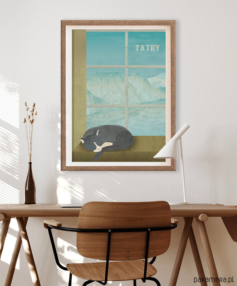 Plakat z polskimi górami - widok z okna na ośnieżone szczyty Tatr. Na pierwszym planie na parapecie drzemie kot, a w oddali góry z majestatycznym Giewontem zachęcają do wędrówki.