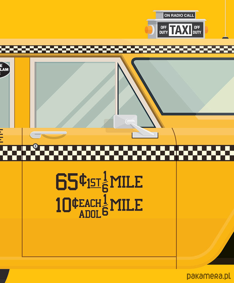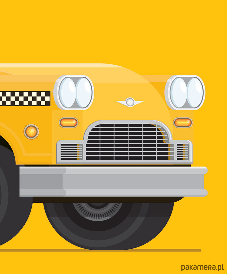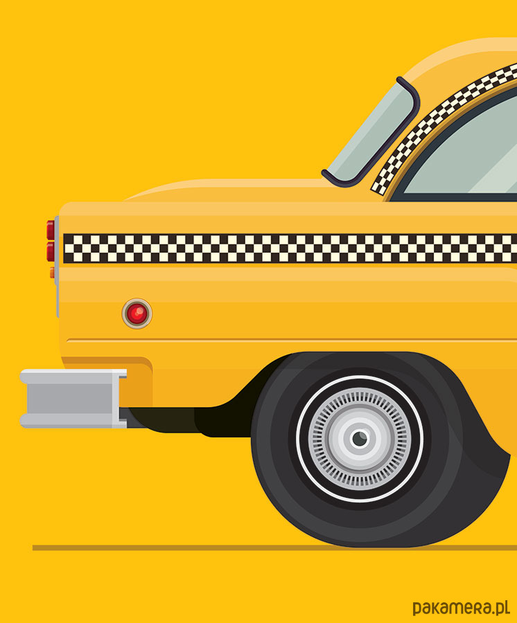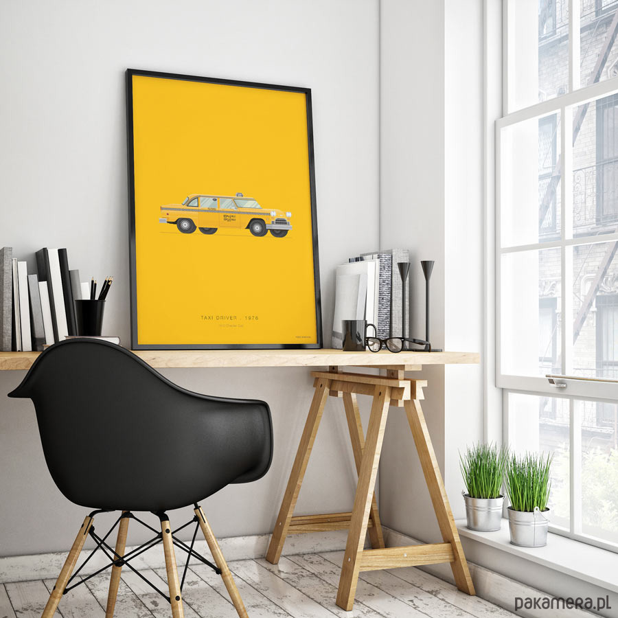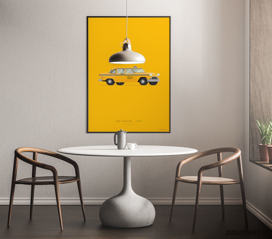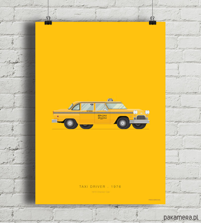 Plakat z autorską grafiką inspirowaną filmem "Taksówkarz" (Taxi Driver). Pochodzi z serii "Famous Cars" i przedstawia samochód Checker Cab - model z 1970 roku.