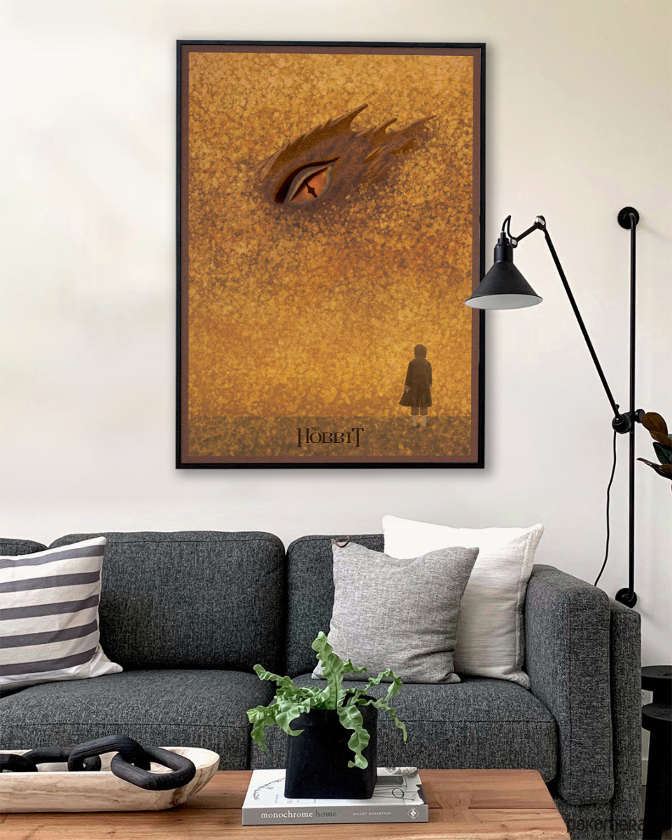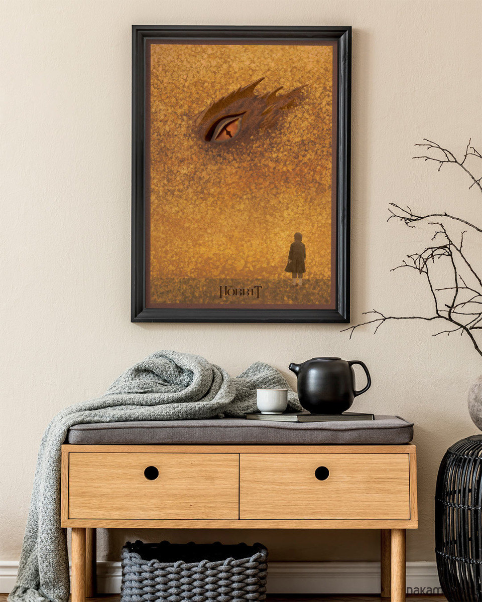 Plakat inspirowany filmową trylogią The Hobbit, reż. Peter Jackson. Przeniesiona na duży ekran książka J.R.R. Tolkiena Hobbit, czyli tam i z powrotem, to wyprawa w świat nieposkromionej wyobraźni. Grafika nawiązuje do drugiej części filmowej sagi, w której centralny wątek stanowi spotkanie Bilba ze Smaugiem we wnętrzu Samotnej Góry.