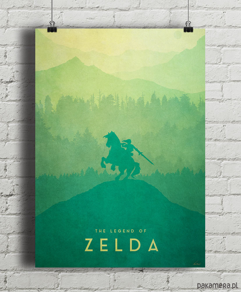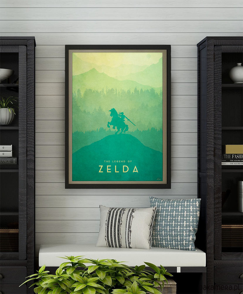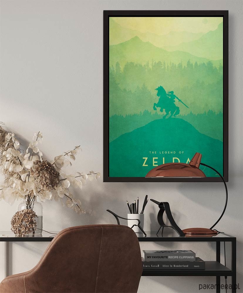 Plakat inspirowany serią gier The Legend of Zelda. Wypełniona zielenią grafika z fantastyczną krainą Hyrule wykreowaną przez japońskich twórców Shigeru Miyamoto i Takashi Tezuka.