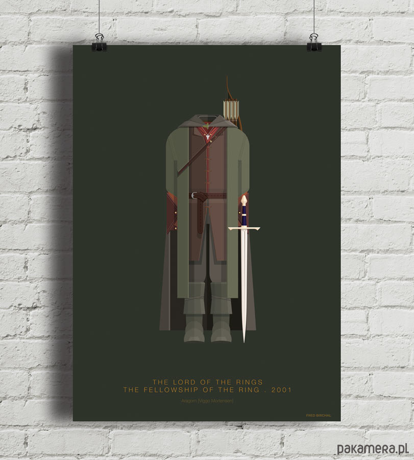 Plakat z autorską grafiką inspirowany filmem "Władca pierścieni: Drużyna Pierścienia" (The Lord of the Rings: The Fellowship of the Ring), reż. Peter Jackson. Pochodzi z serii "Cinema Costumes" (Kostiumy kinowe) i przedstawia strój Aragorna.