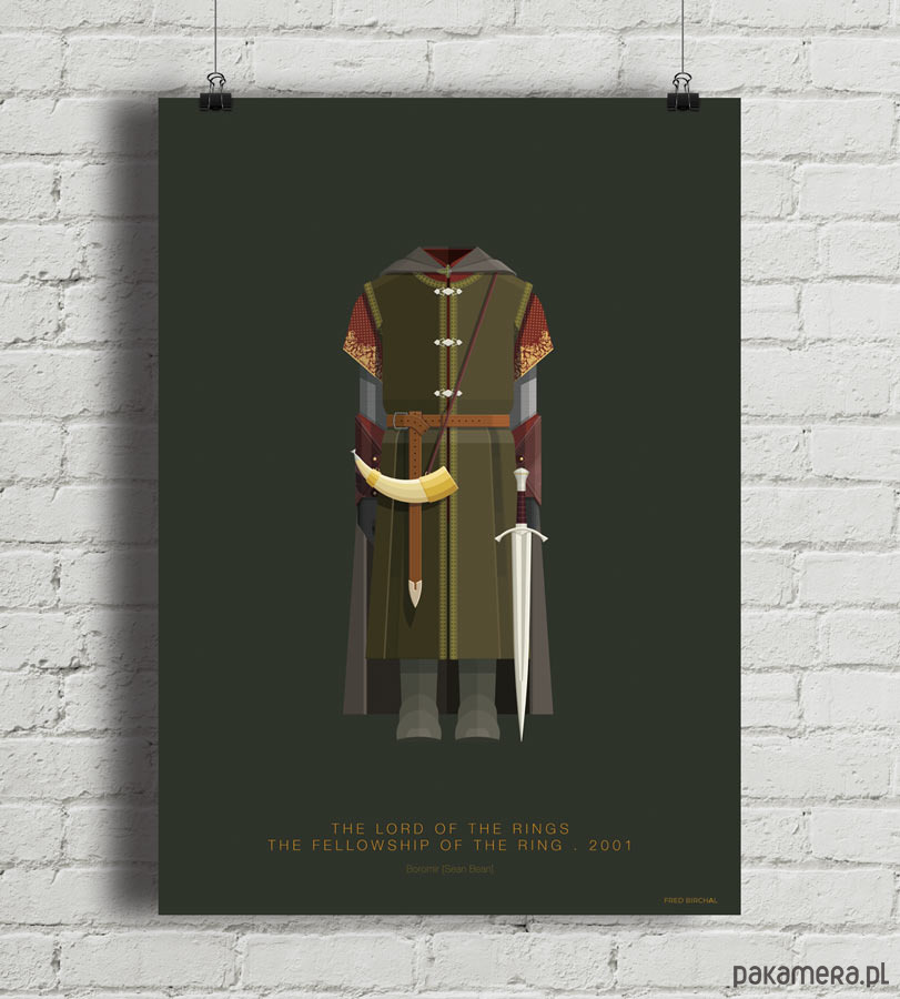 Plakat z autorską grafiką inspirowany filmem "Władca pierścieni: Drużyna Pierścienia" (The Lord of the Rings: The Fellowship of the Ring), reż. Peter Jackson. Pochodzi z serii "Cinema Costumes" (Kostiumy kinowe) i przedstawia strój Boromira.