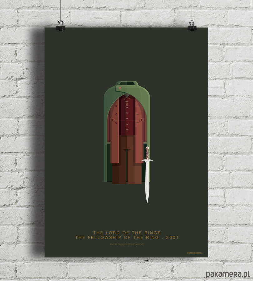 Plakat z autorską grafiką inspirowany filmem "Władca pierścieni: Drużyna Pierścienia" (The Lord of the Rings: The Fellowship of the Ring), reż. Peter Jackson. Pochodzi z serii "Cinema Costumes" (Kostiumy kinowe) i przedstawia strój Froda.