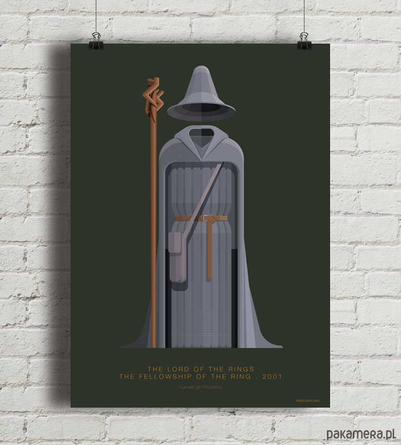 Plakat z autorską grafiką inspirowany filmem "Władca pierścieni: Drużyna Pierścienia" (The Lord of the Rings: The Fellowship of the Ring), reż. Peter Jackson. Pochodzi z serii "Cinema Costumes" (Kostiumy kinowe) i przedstawia strój Gandalfa.