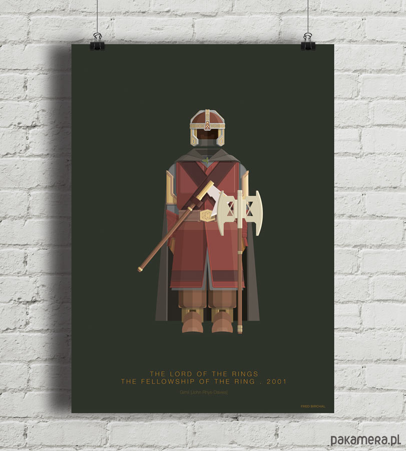 Plakat z autorską grafiką inspirowany filmem "Władca pierścieni: Drużyna Pierścienia" (The Lord of the Rings: The Fellowship of the Ring), reż. Peter Jackson. Pochodzi z serii "Cinema Costumes" (Kostiumy kinowe) i przedstawia strój Gimliego.