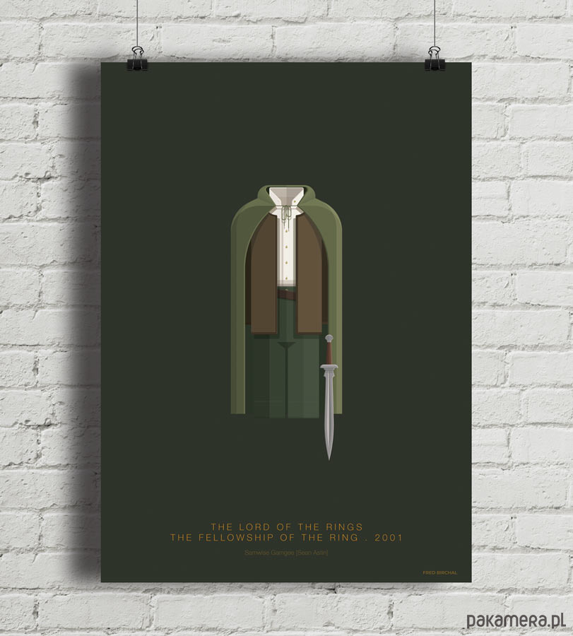 Plakat z autorską grafiką inspirowany filmem "Władca pierścieni: Drużyna Pierścienia" (The Lord of the Rings: The Fellowship of the Ring), reż. Peter Jackson. Pochodzi z serii "Cinema Costumes" (Kostiumy kinowe) i przedstawia strój Sama Gamgee.