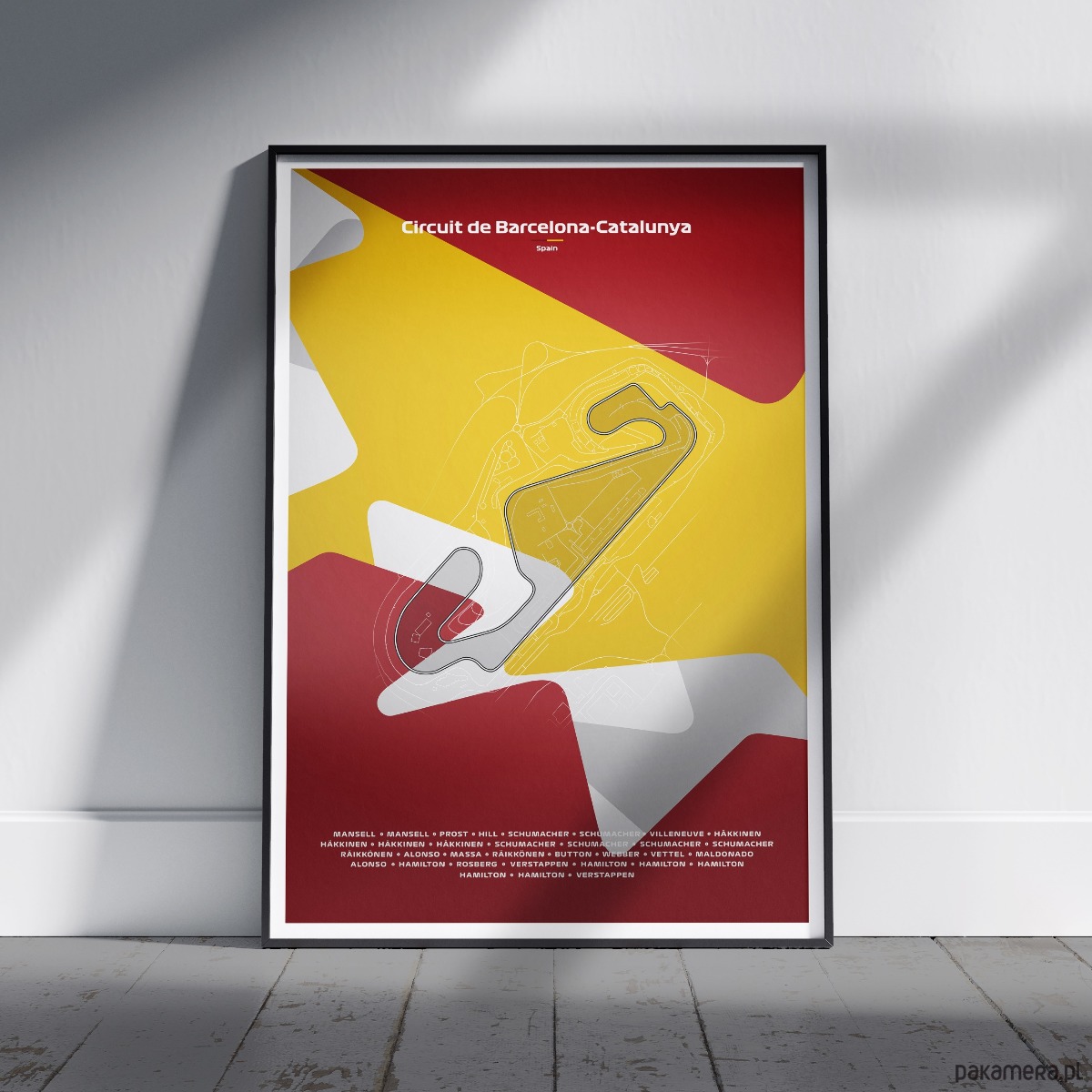 Grafika przedstawia obrys toru Circuit de Barcelona wraz ze wszystkimi zwycięzcami Grand Prix.