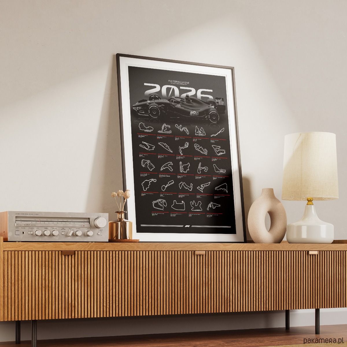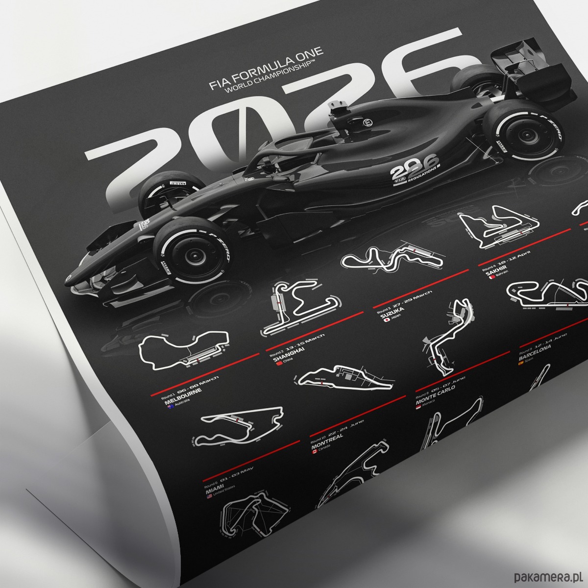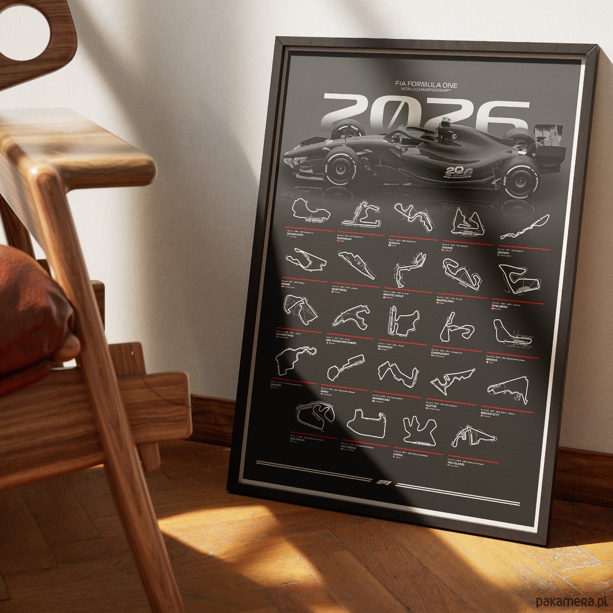 Plakat przedstawia wszystkie tory w kalendarzu F1 2026 wraz z datami każdego weekendu Grand Prix.