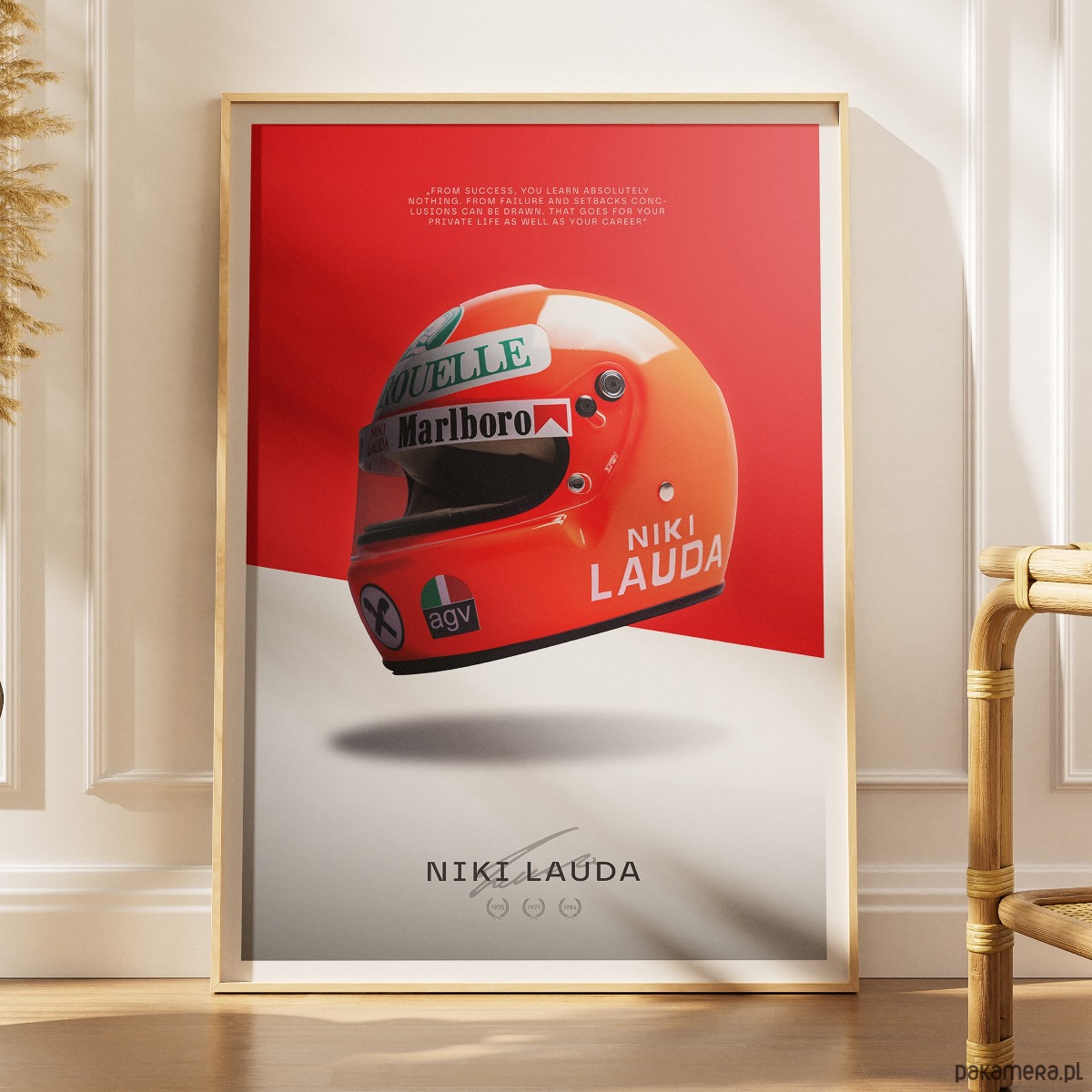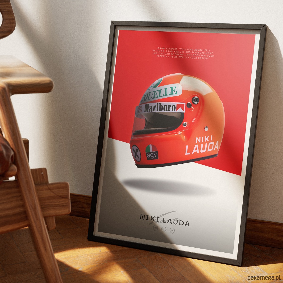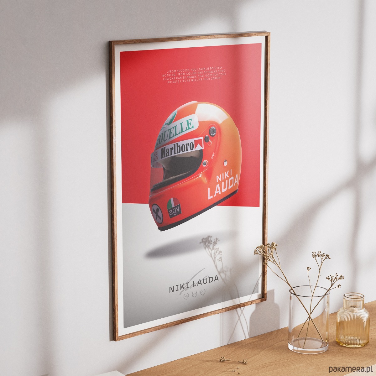 Stylowy, nowoczesny plakat przedstawiający kultowy czerwony kask jednego z największych kierowców w historii motorsportu. Minimalistyczna kompozycja, mocne kontrasty i elegancka typografia nadają mu charakter premium, dzięki czemu idealnie sprawdzi się zarówno w salonie, biurze, jak i w przestrzeni fana Formuły 1. Wysokiej jakości druk odwzorowuje intensywne barwy oraz detale, podkreślając legendarny design kasku.