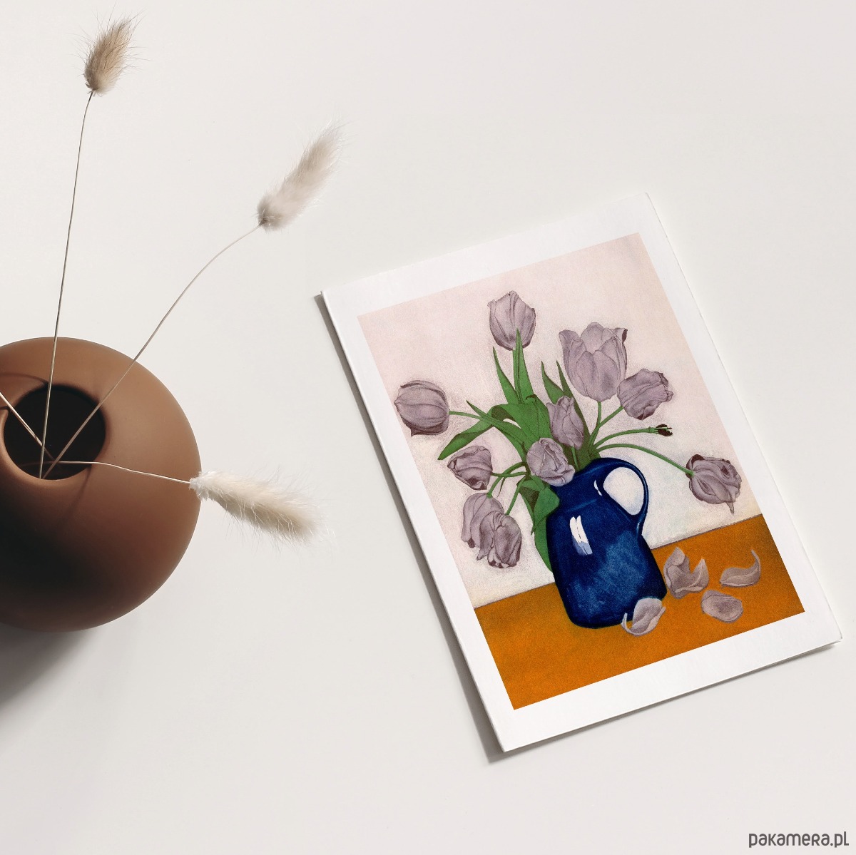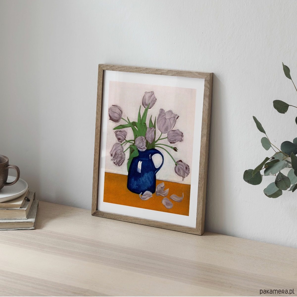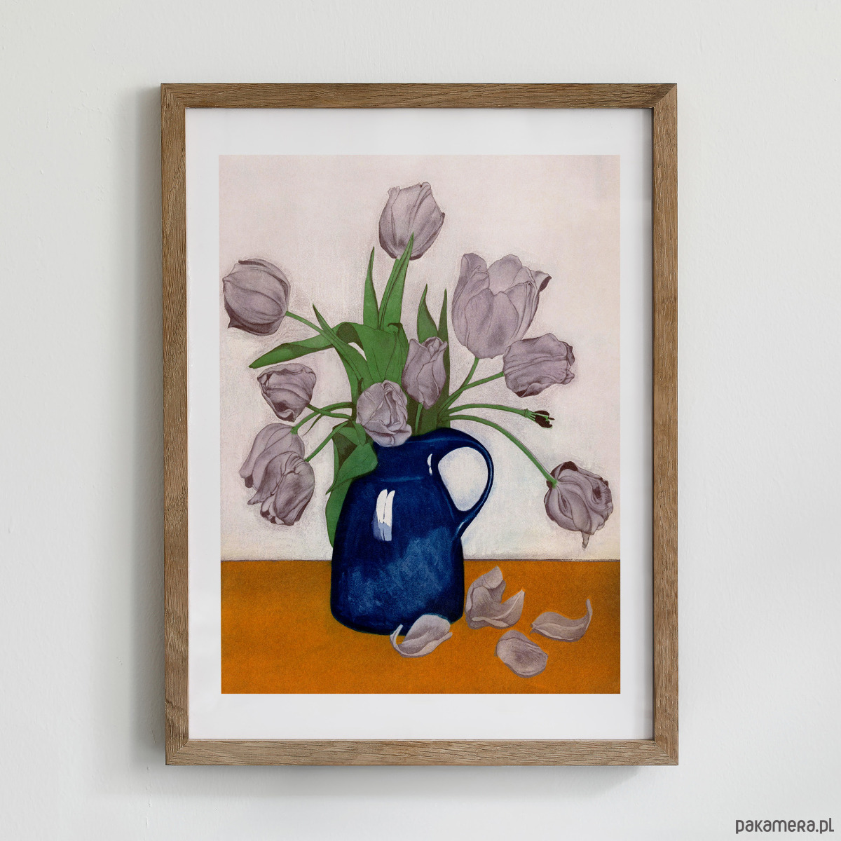 Plakat przedstawiający bukiet tulipanów w dzbanku.