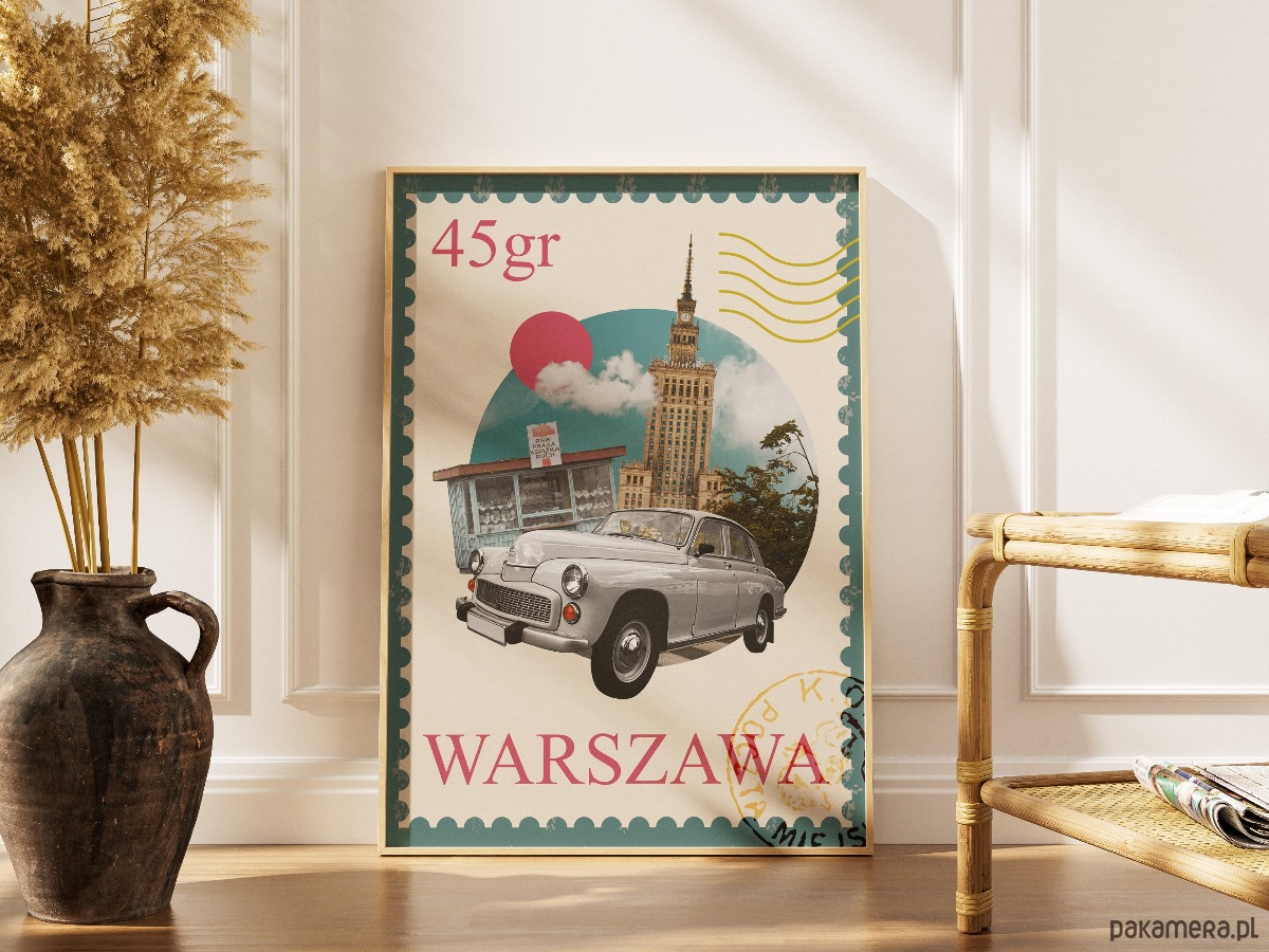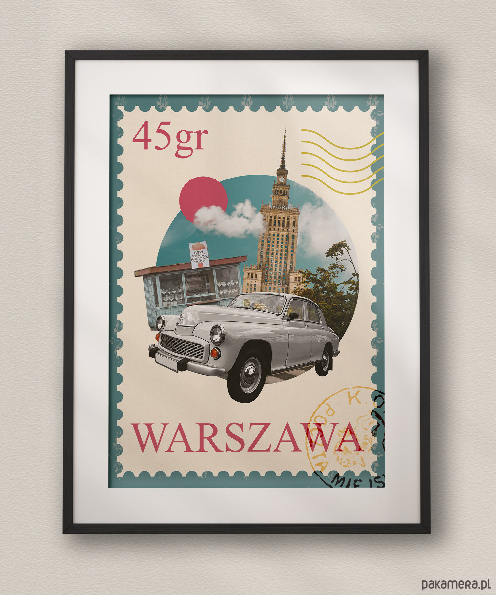 Plakat „U nas w Warszawie” to wyjątkowy kolaż w formie znaczka pocztowego, który łączy w sobie ducha stolicy i klimat PRL. Na pierwszym planie widnieje klasyczny samochód Warszawa – ikona polskiej motoryzacji, a w tle dumnie góruje Pałac Kultury i Nauki, jeden z najbardziej rozpoznawalnych symboli miasta. Obok zobaczyć można kiosk rodem z tamtych lat, który dopełnia nostalgiczny charakter kompozycji.