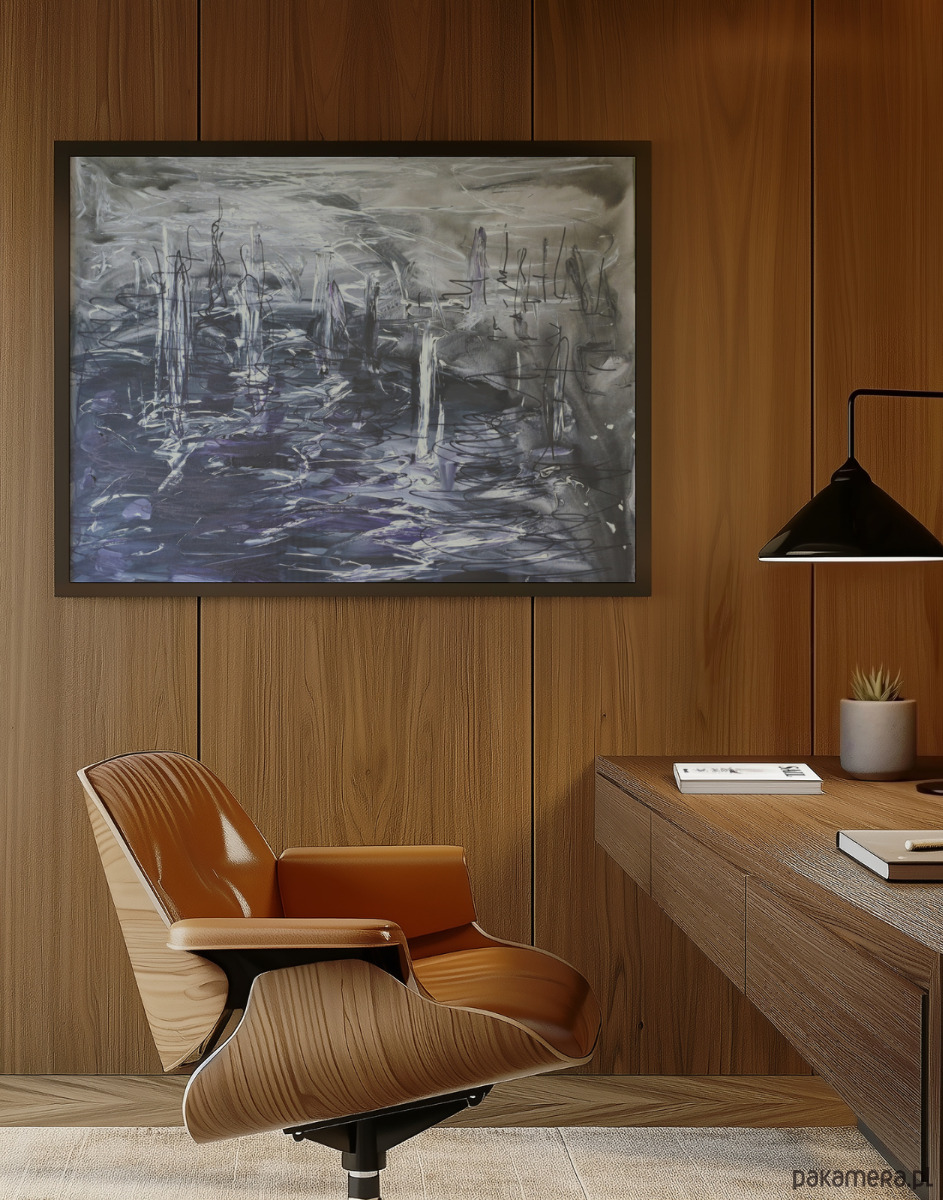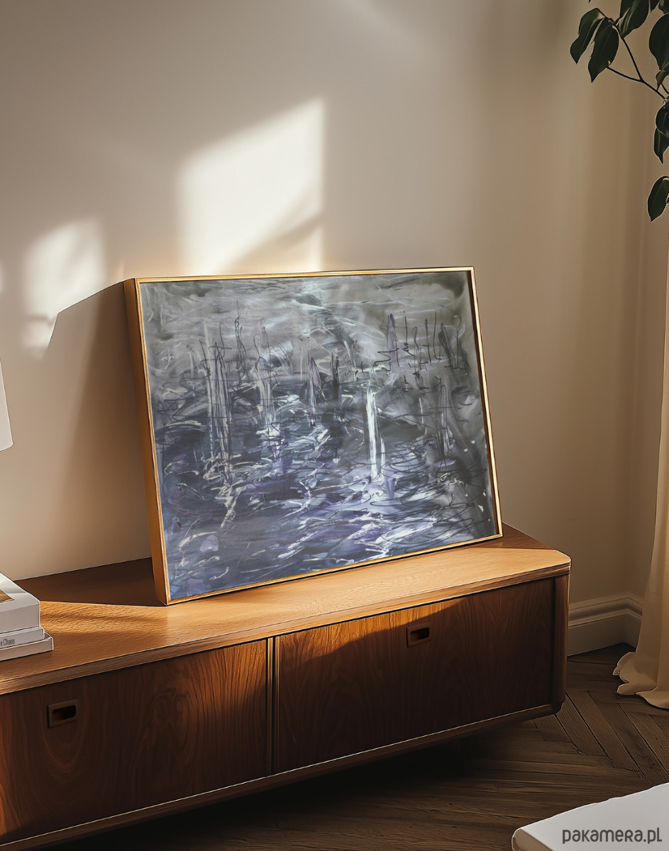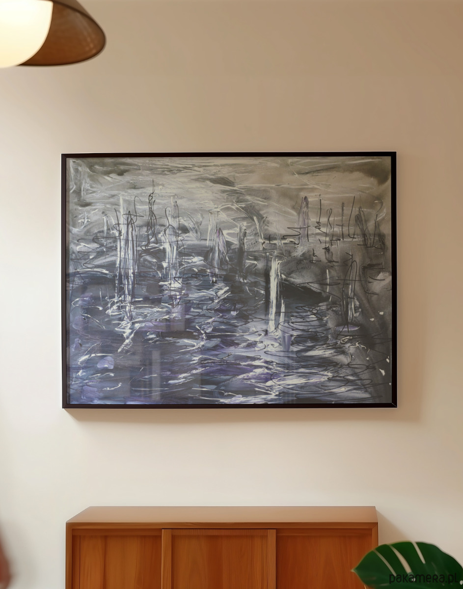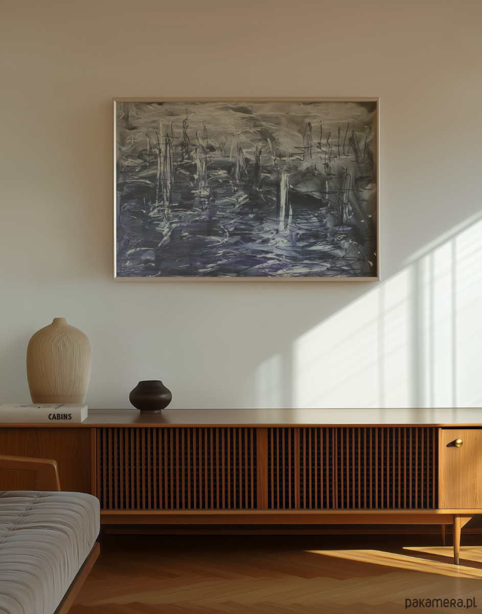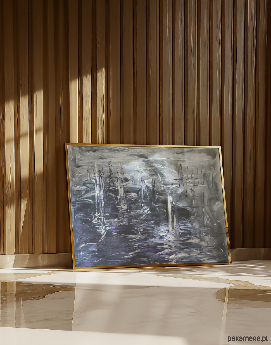 Hipnotyzujący abstrakcyjny pejzaż, w którym chłodne szarości, fiolety i biel tworzą atmosferę mgły, wody i subtelnego ruchu. Dynamiczne pociągnięcia pędzla budują wrażenie fal, refleksów i drgającej przestrzeni — jakby zatrzymany został moment ciszy tuż przed zmianą pogody.
