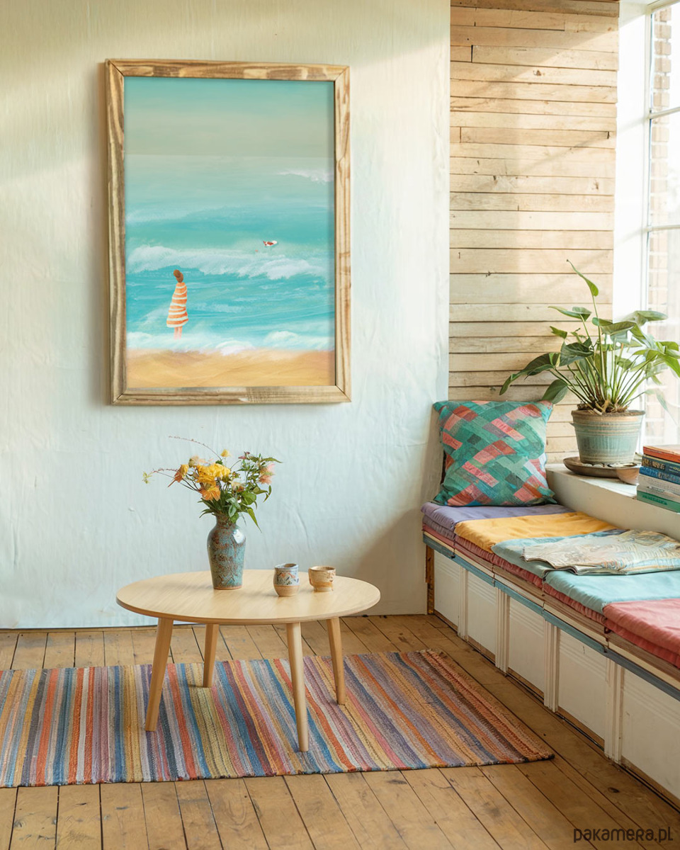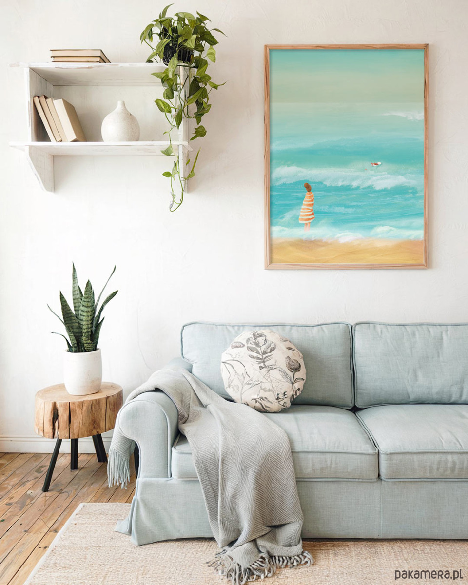Plakat Wakacje z psem w ciepłych błękitach oswaja krajobraz morski zmieniając go we wspomnienie idealnego, letniego dnia. Plakat wakacyjny doskonale wpisuje się w filozofię slow life i zachęca, by cieszyć się każdą chwilą.