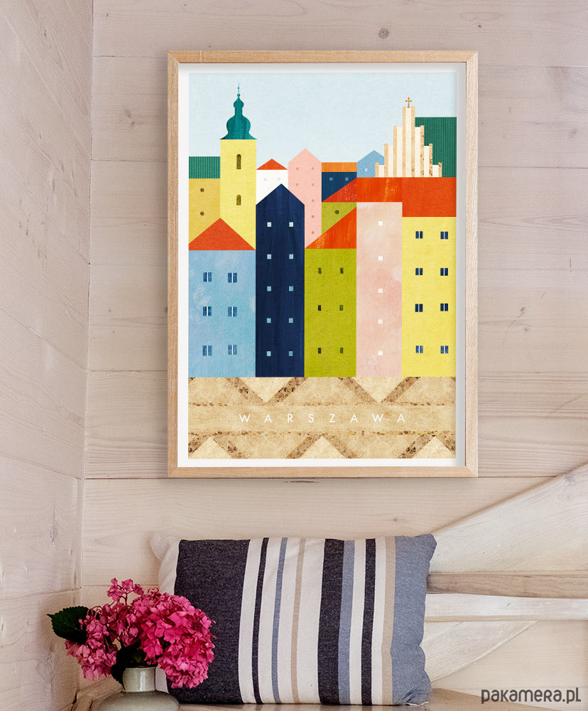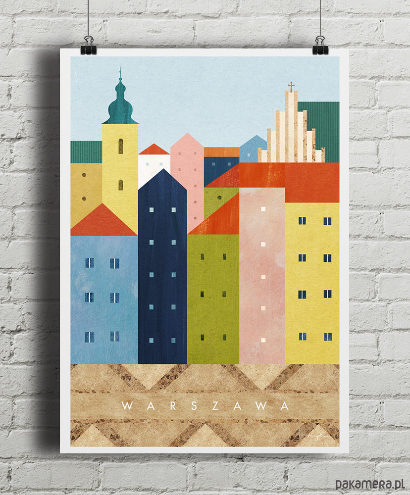 Plakat Warszawa zabiera nas na bajecznie kolorową starówkę. Z placu zamkowego podziwiać możemy rząd barwnych kamienic, zza których wyłaniają się zabytki Warszawy - bazylika św. Jana Chrzciciela oraz żółta wieża kościoła św. Marcina.