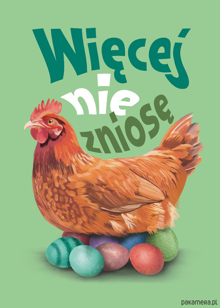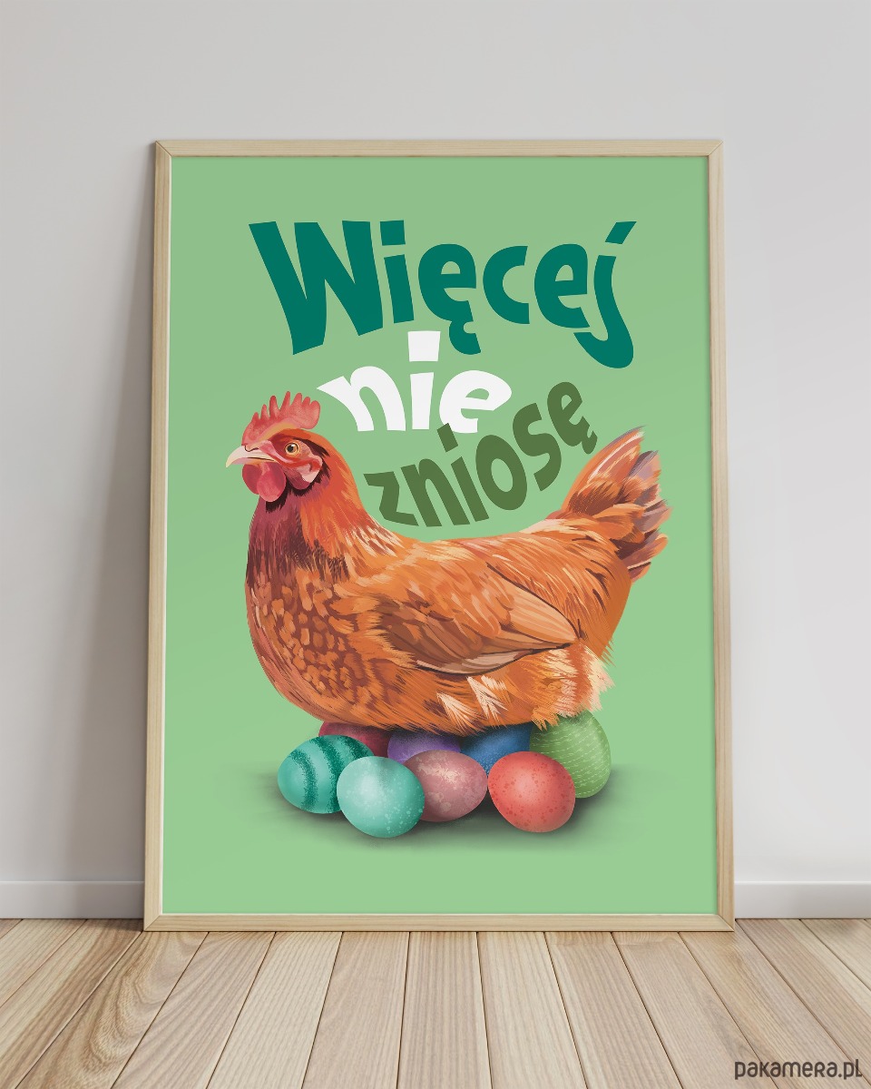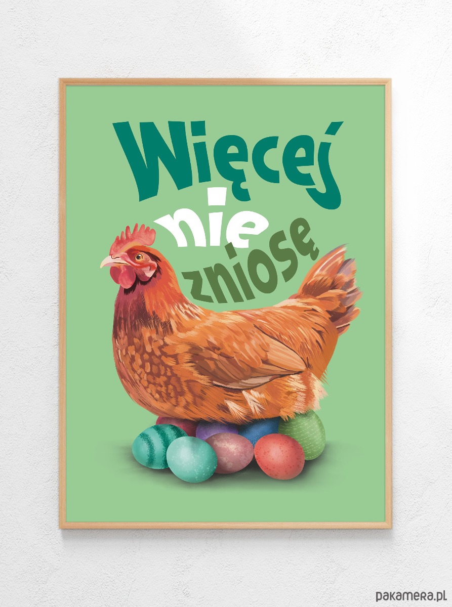 Wielkanoc tuż-tuż, a ta kura już wie, że czeka ją wyjątkowo pracowity czas. „Więcej nie zniosę” to humorystyczny plakat, który z przymrużeniem oka komentuje świąteczne przygotowania – te nasze i te… jajeczne. Urocza ilustracja rozbawi, ale też przypomni, że nie tylko my padamy na twarz przed świętami. Idealny dodatek do kuchni, przedpokoju albo jako prezent dla tych, którzy – jak kura – dają z siebie wszystko.