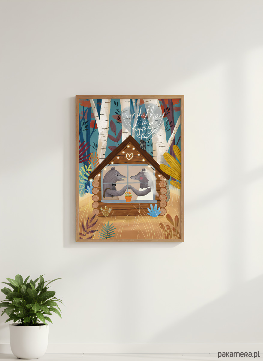 Nastrojowy plakat autorstwa Oli Świder przedstawiający dwa wilki biorące ślub w leśnej chatce. Magiczna, symboliczna scena wydrukowana na matowym, aksamitnym papierze 230 g w formacie A3. Idealny dla miłośników natury, zwierząt i bajkowych ilustracji.