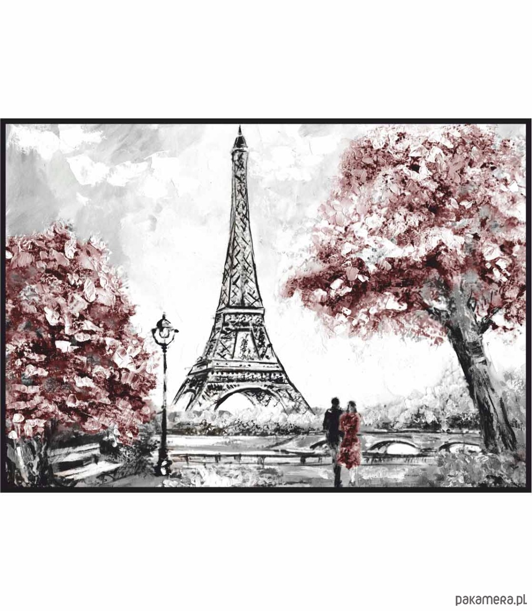 Klimatyczny plakat, na którym w tle widać Wieżę Eiffla, na pierwszy plan wyłaniają się kwitnące drzewa oraz spaceruje zakochana para.