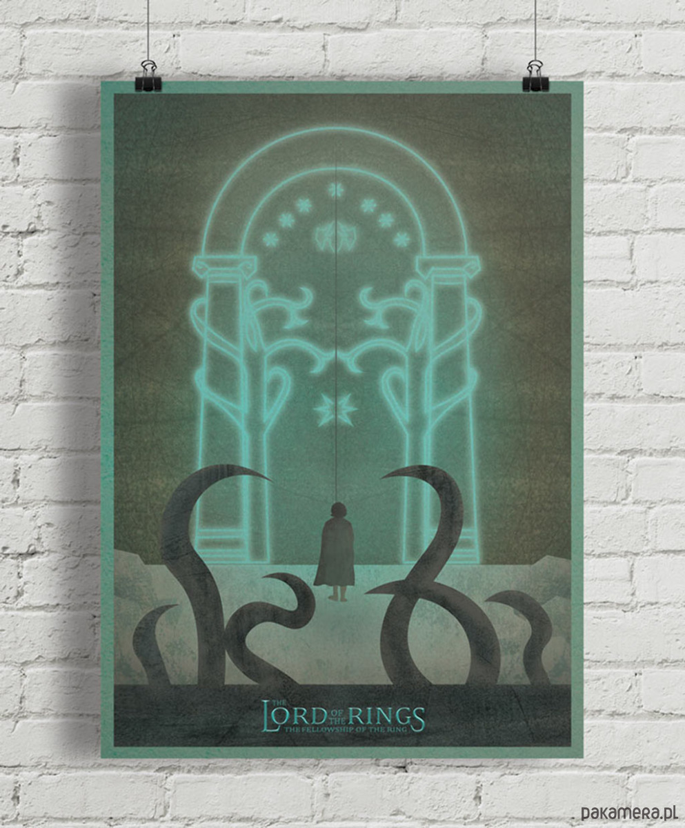 Plakat inspirowany filmem Władca Pierścieni: Drużyna Pierścienia (The Lord of the Rings: The Fellowship of the Ring), reż. Peter Jackson. Na plakacie widzimy scenę, w której Frodo stoi przed rozświetloną na niebiesko bramą prowadzącą do Morii. Na pierwszym planie z mrocznej wody wyłaniają się macki potwora.